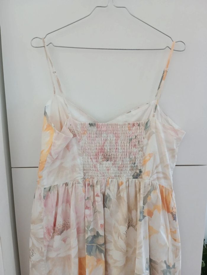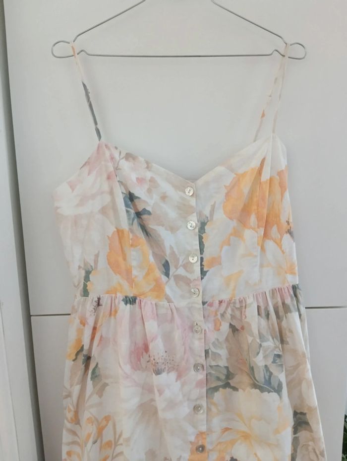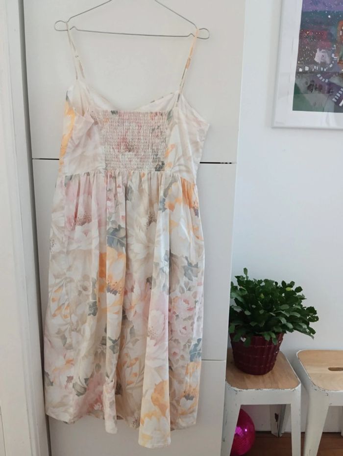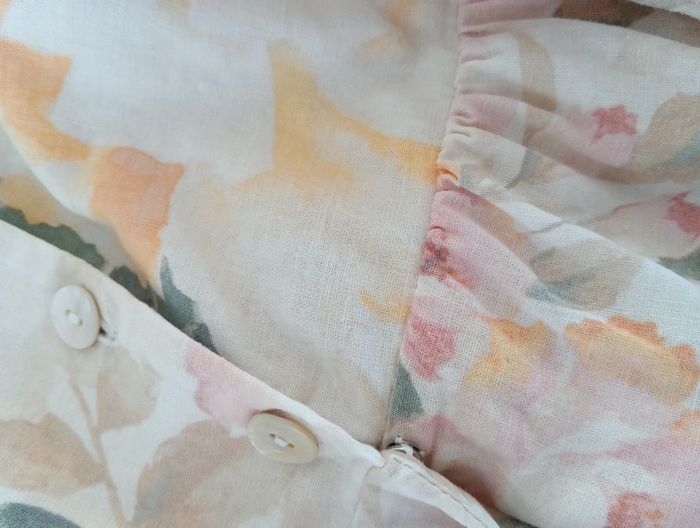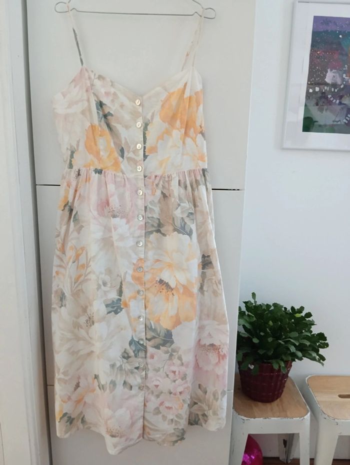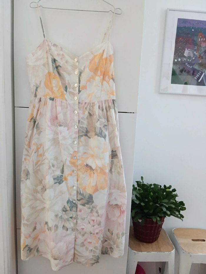 Magnifique Robe longue boutonnée lin et coton taille 44 indiquée, doit convenir pour 42/44 H&M linen Blend Dos smocké Bretelles réglables Fleurs pastel Une petite pression a été ajoutée au niveau de la taille. Mesures Aisselles 49cm Taille 43cm Longueur 118cm Doublée en coton.