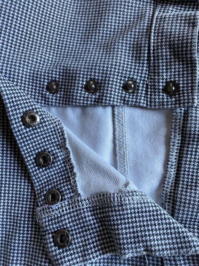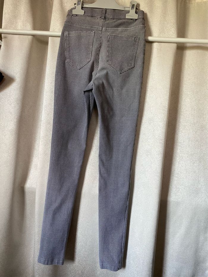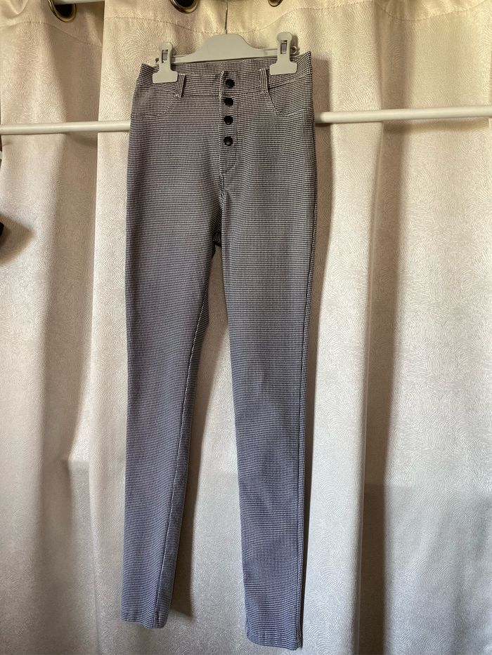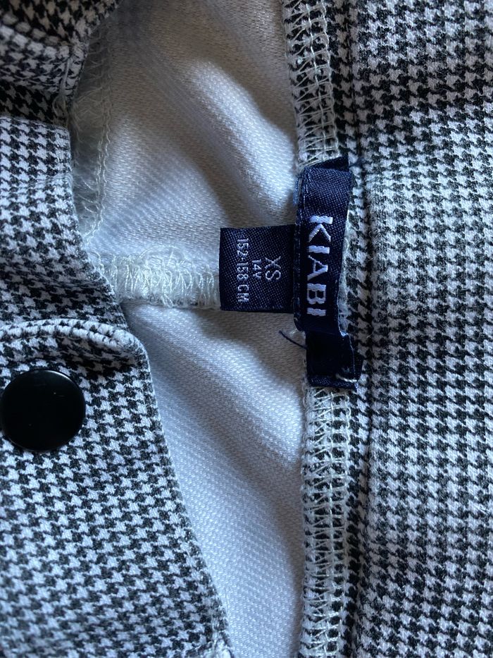 Pantalon fuseau à la bardot ( il est en très bon état) Taille haute Tissu extensible fin pied de poule noir et blanc Fermeture par pressions Taille XS ou 14 ans stature 152-158 cm ( cette stature correspond normalement à un 12 ans) kiabi