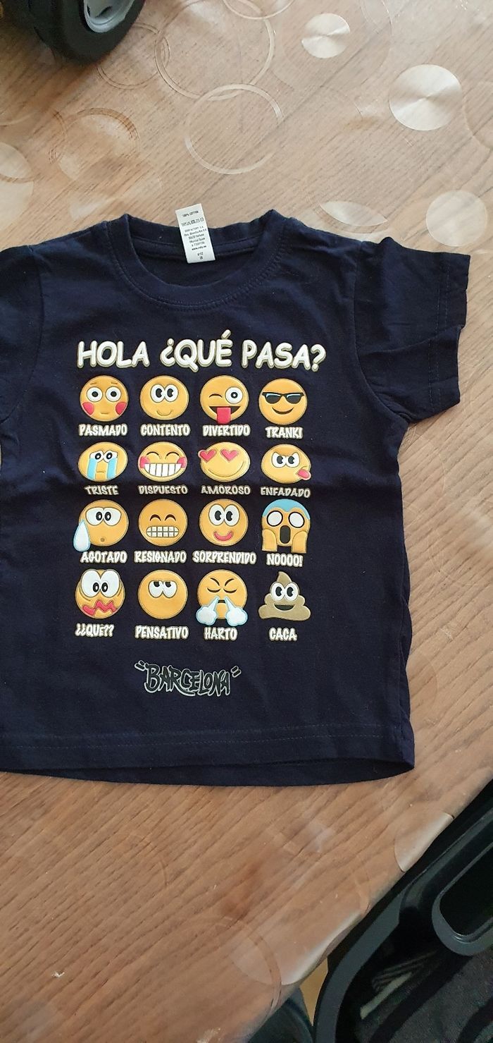 Lot de 3 tee-shirts manches courtes garçon 👦 Taille 2 ans Couleur 1 bleu marine avec inscription, 1 bleu marine et 1 vert avec emoticos venant de Barcelone non portés Maison non fumeur