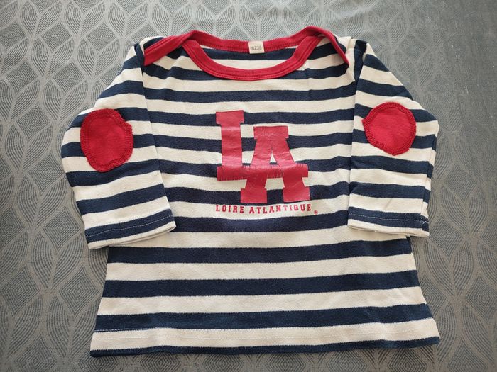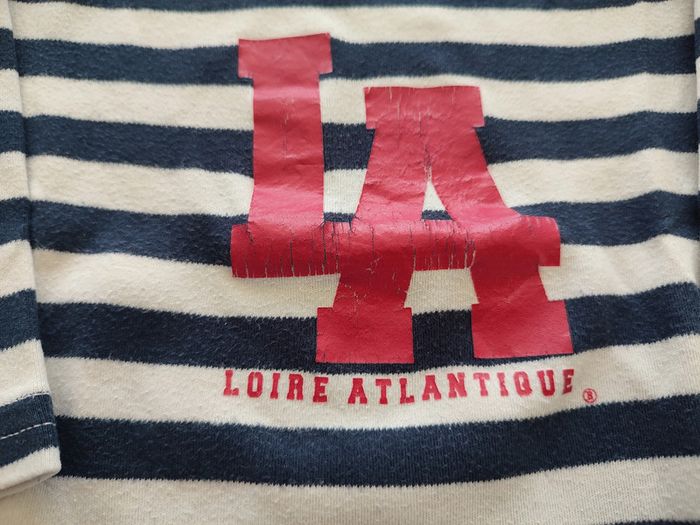 T-shirt manches longues marinière L.A. Loire Atlantique 12 mois (noté 6-12 mois mais correspond à du 12 mois) Très bon état hormis flocage craquelé