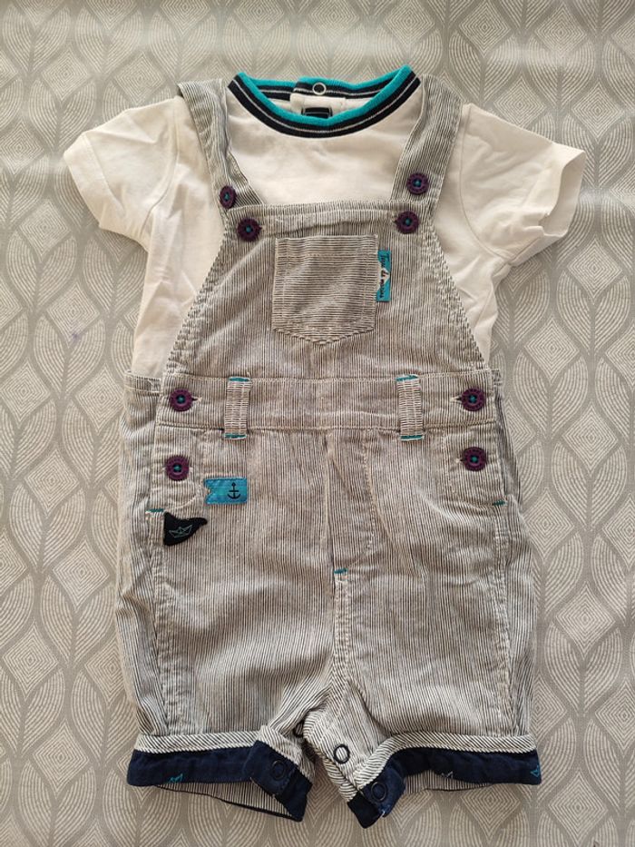 Ensemble t-shirt manches courtes + salopette short qui s'ouvre à l'entrejambe 6 mois Terre de Marins Très bon état