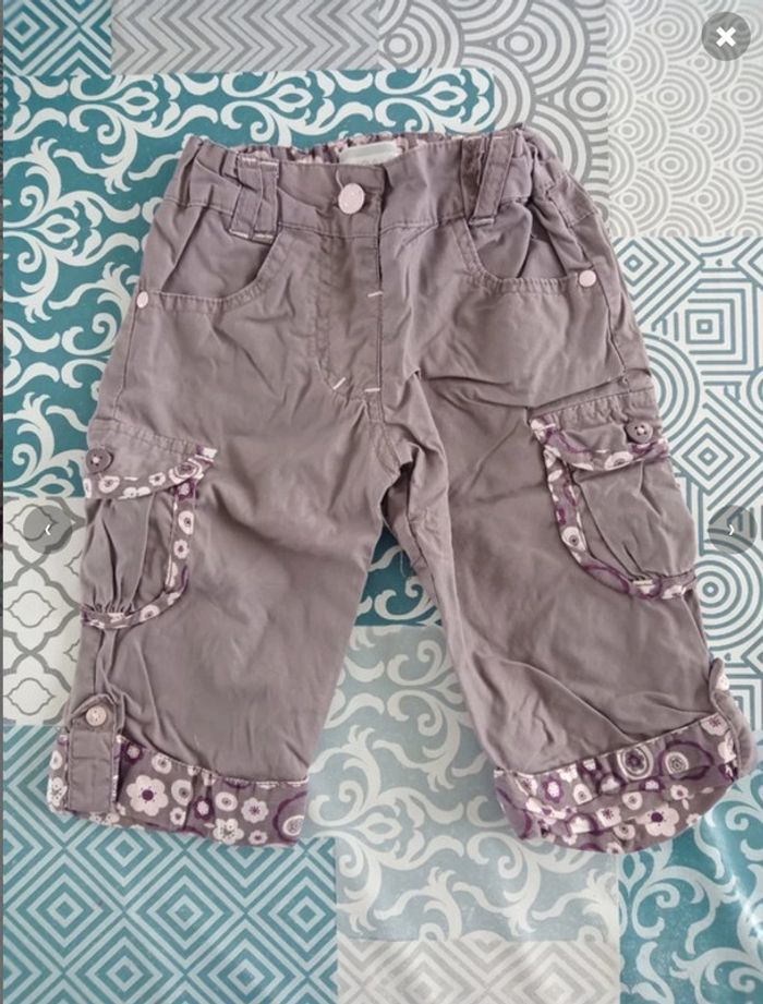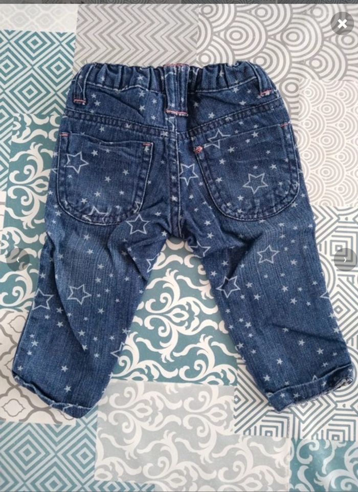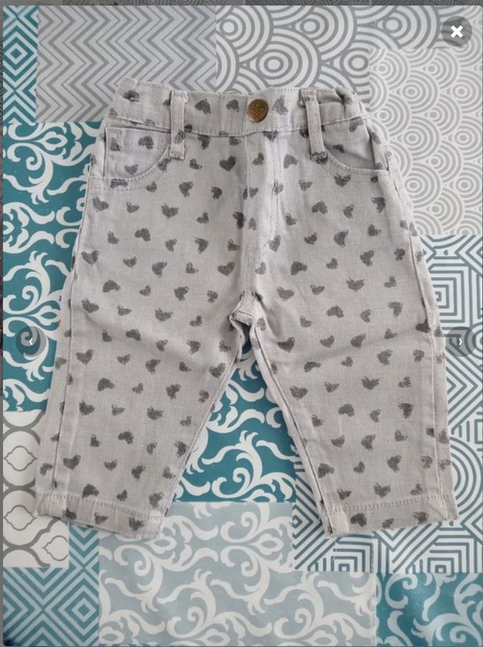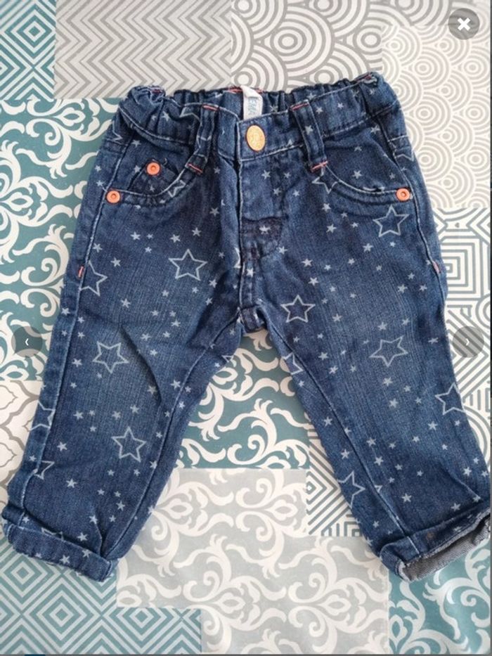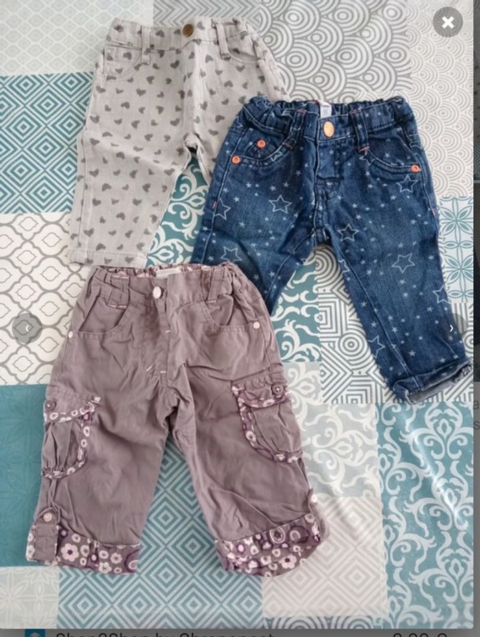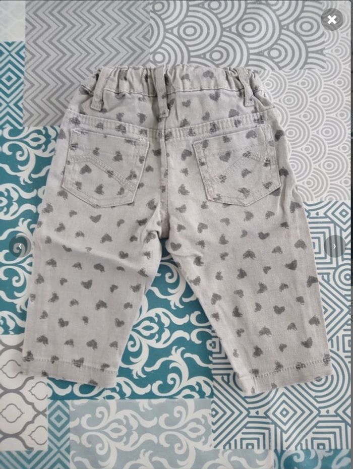 Lot de 3 pantalons bébé fille comprenant : 1 jeans motif étoiles Hema 1 pantalon gris motif coeurs Prends ton pouce 1 pantalon marron Kimbaloo 6 mois Très bon état