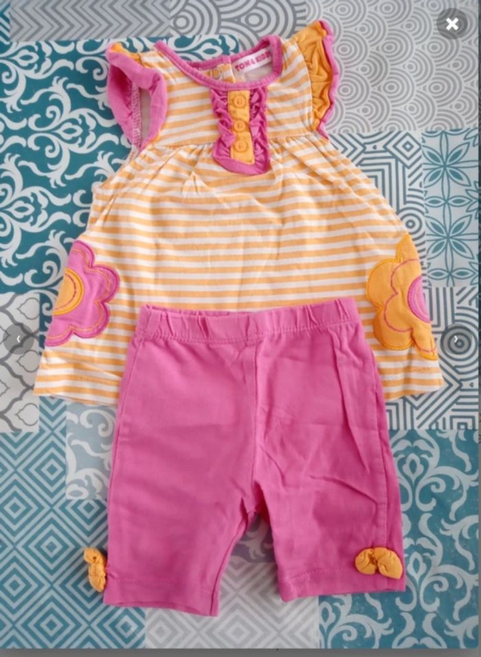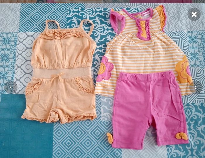 Lot de 2 ensembles bébé fille printemps été : combishort (couleur un peu délavée) + haut et legging short 3 mois Influx et Tom & kiddy