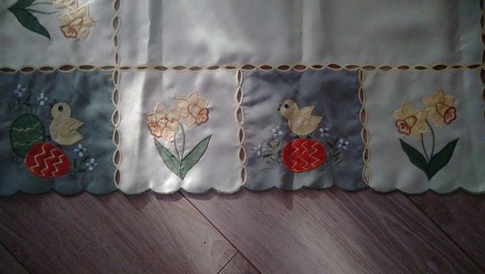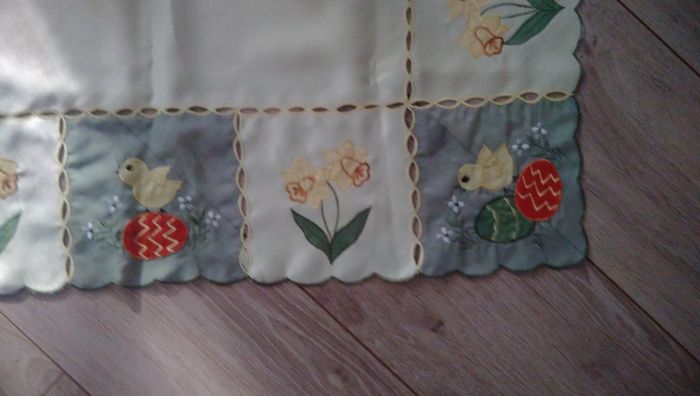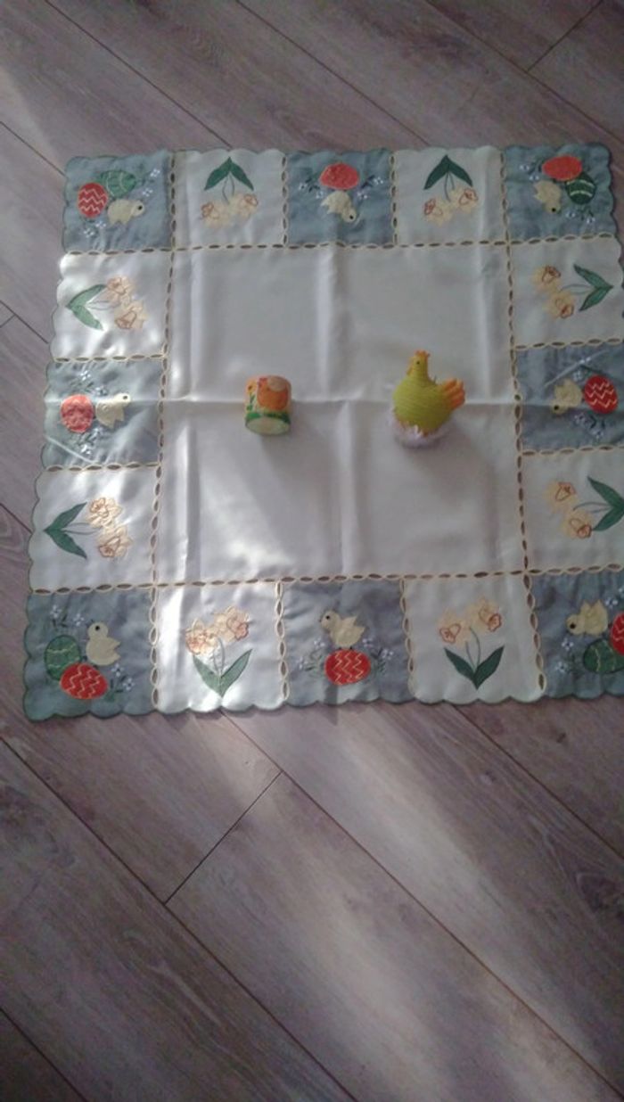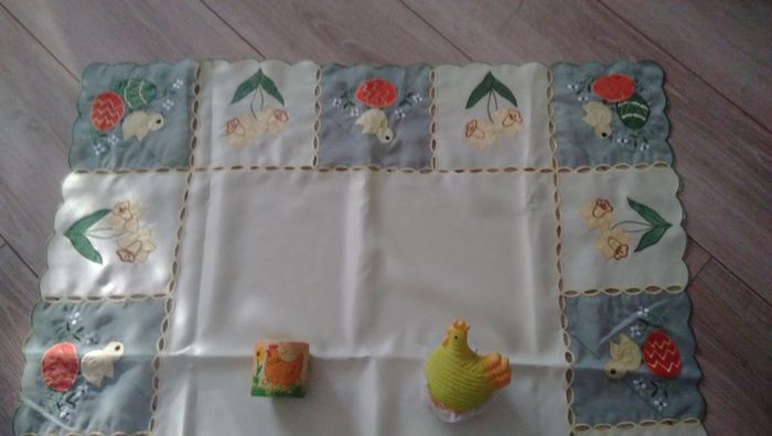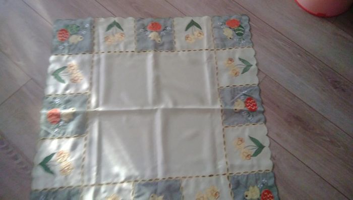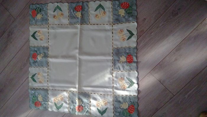 Lot composé d'un carré 100% polyester vert pâle motif poussins et oeuf brodés, article neuf dimensions 85x85 cm.