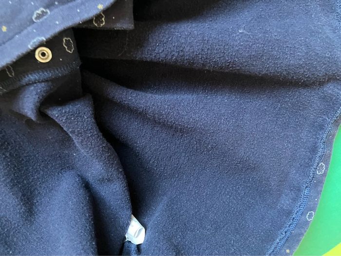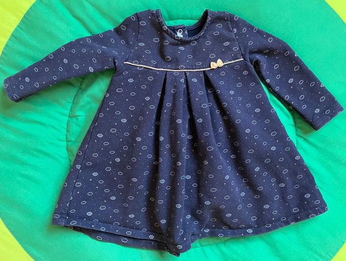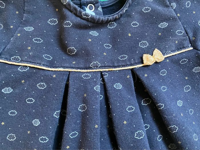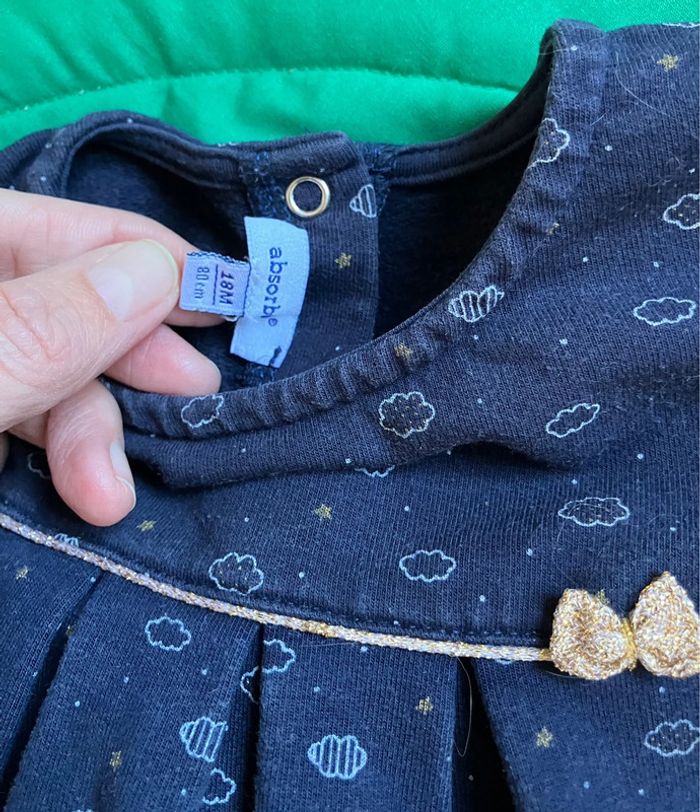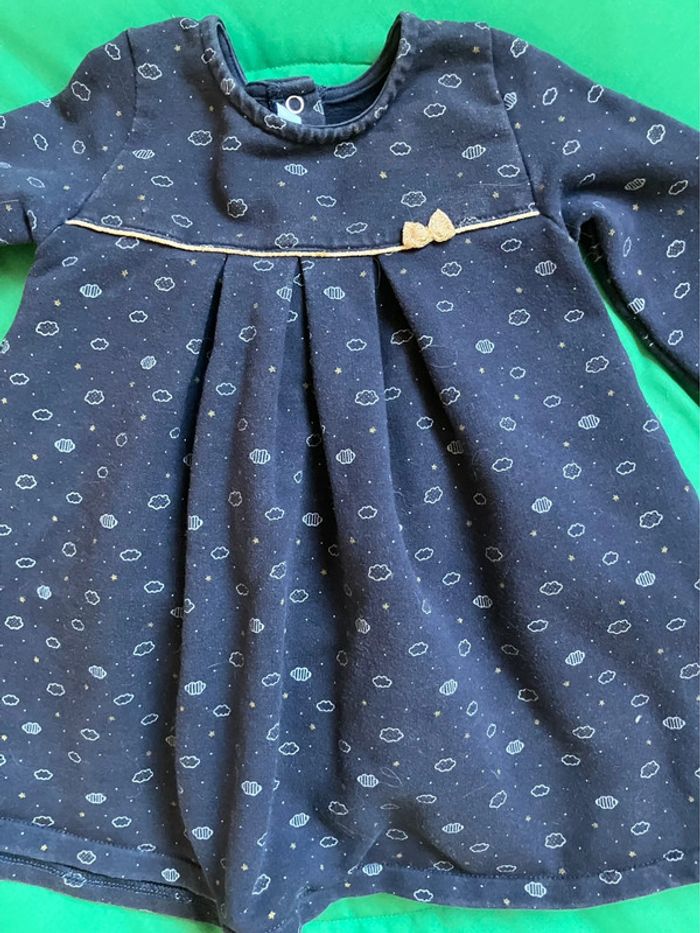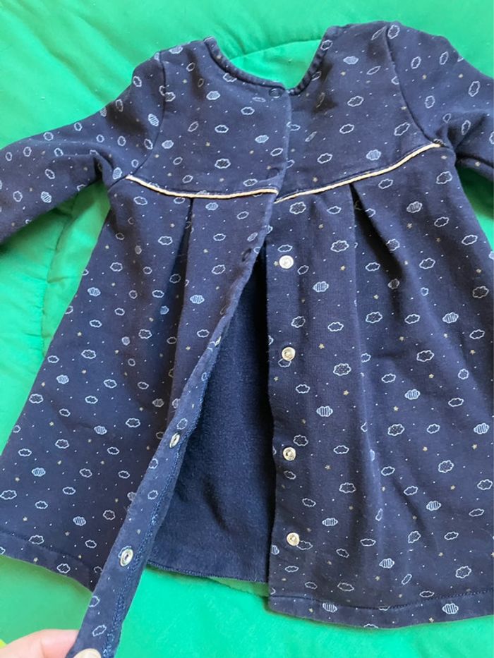 Robe manches longues Absorba Facile à mettre. Elle s’enfile comme une veste. Elle s’attache par pression derrière Très chouette. Plissée sur le devant. Elle est bleu marine avec motif nuage blanc et fil doré avec noeud doré Robe d’hiver. Épaisse. 18 mois #lollys13_18mois #lollys13_absorba