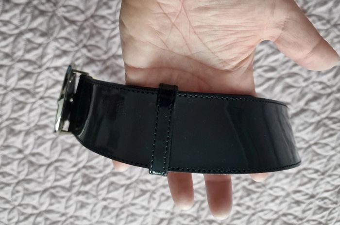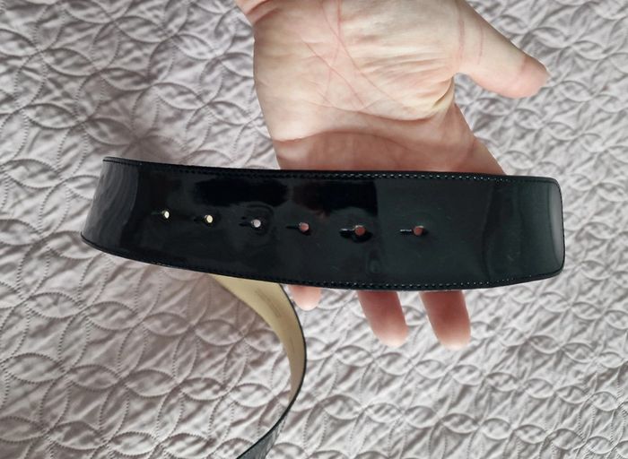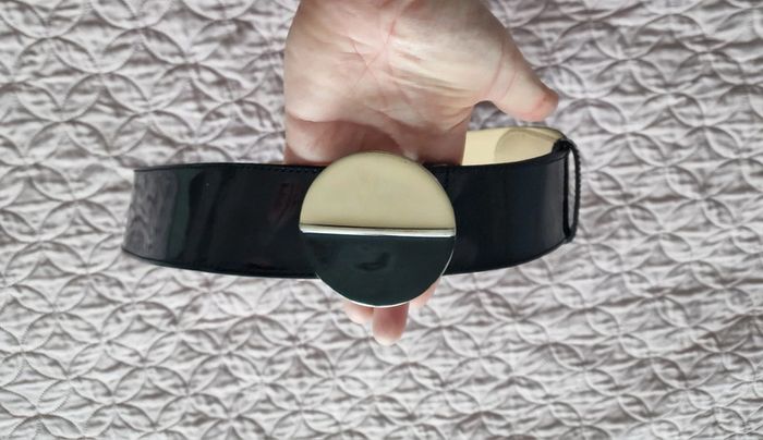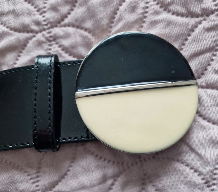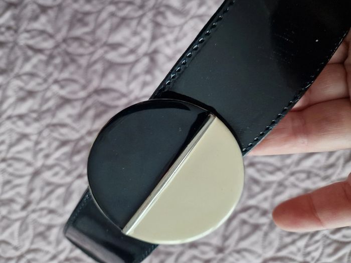 Ceinture vernis noir , croûte vachette Maison 1 2 3 taille 40 / 42 réglable 98 cm sans la boucle , largeur 5 cm , boucle 6.5 cm de diamètre , couleur noir / crème.