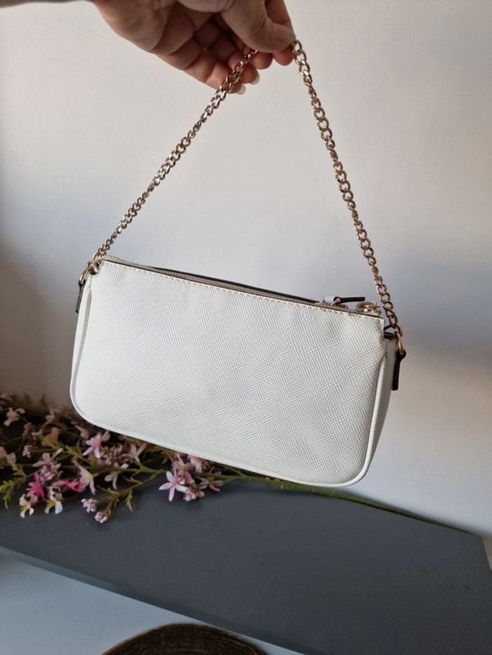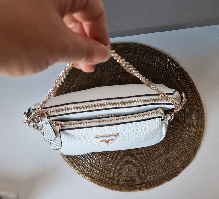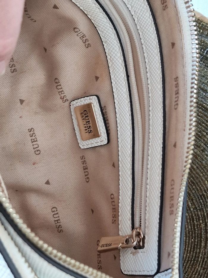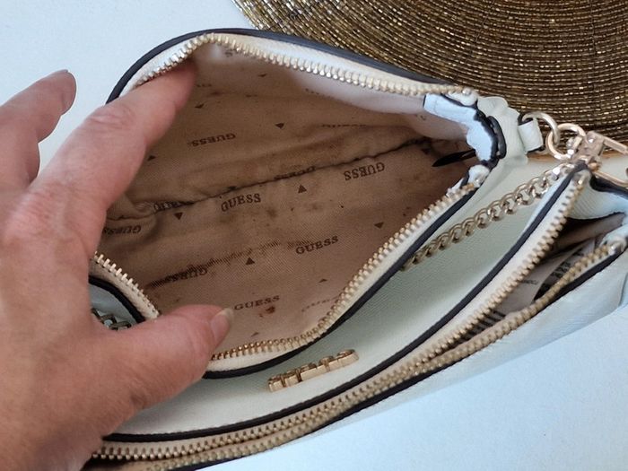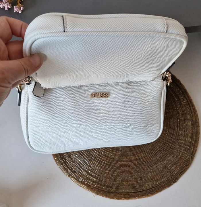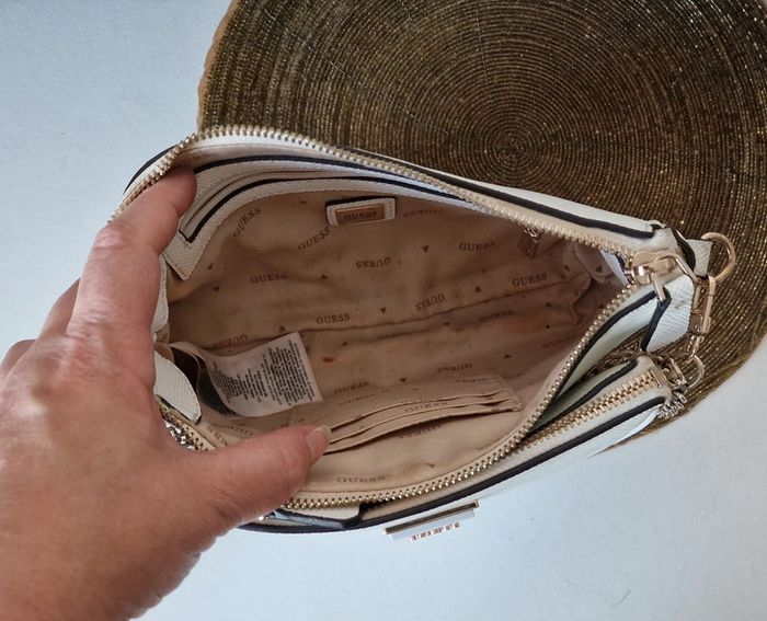 Sacoche GUESS Modele Noelle safiano Valeur 125 euro 24 x 14 20 x 11 Doublure à nettoyer Extérieur en similicuir. Fermeture à glissière. Pièces métalliques couleur or pâle. Finition Saffiano. Pochette extérieure amovible avec glissière. Logo triangulaire sur le devant.