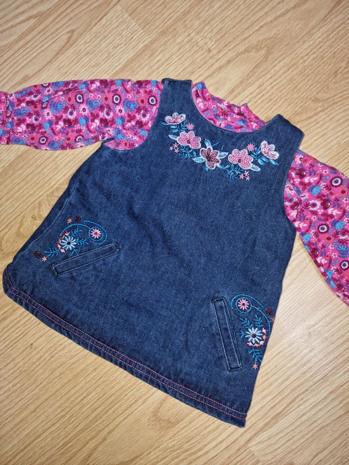 Bonjour, je vends cet ensemble, le maillot à longues manches rose et bleu et la robe en jean. Marque tissaia de taille 6 mois
