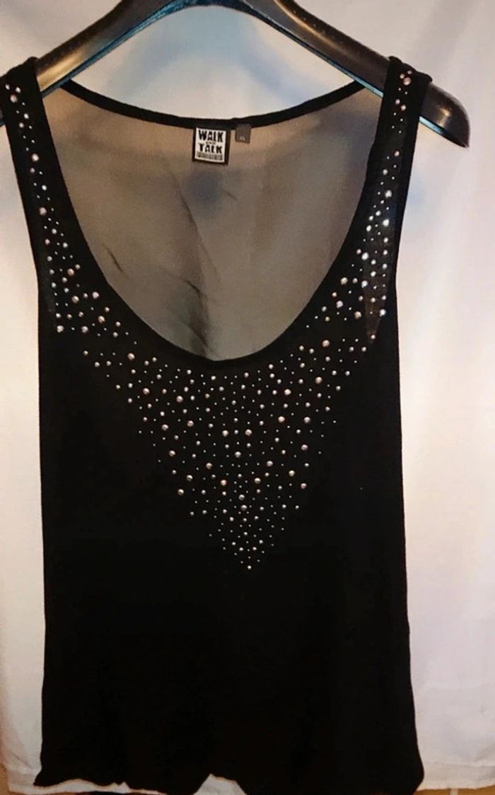 Débardeur noir et strass sur le devant, dos noir transparent. Peu porté Walk and talk. Taille XL:42