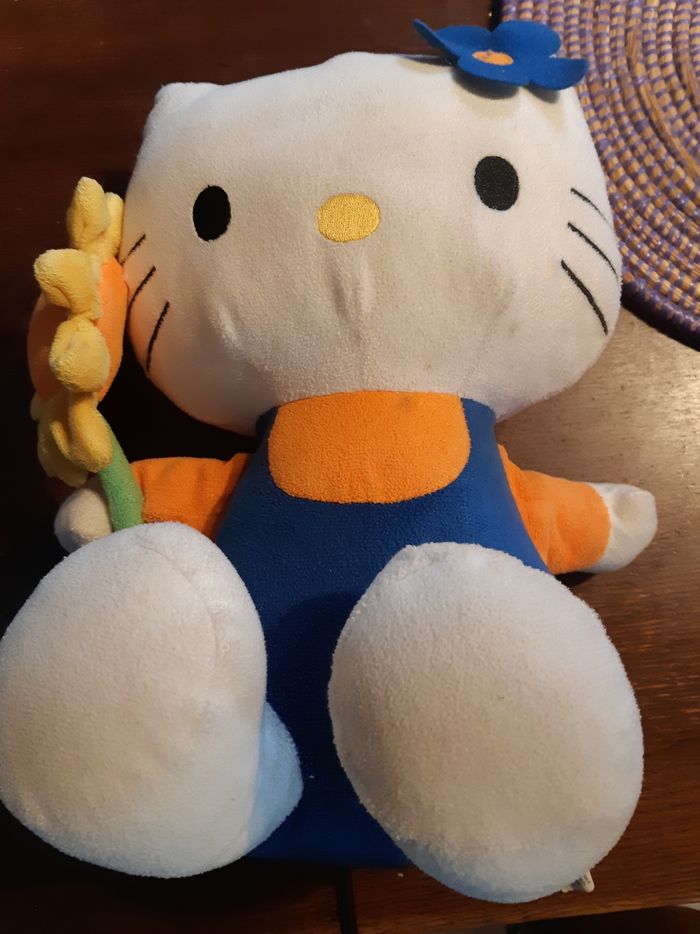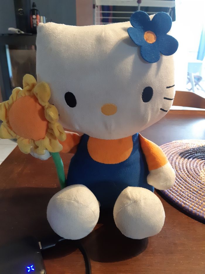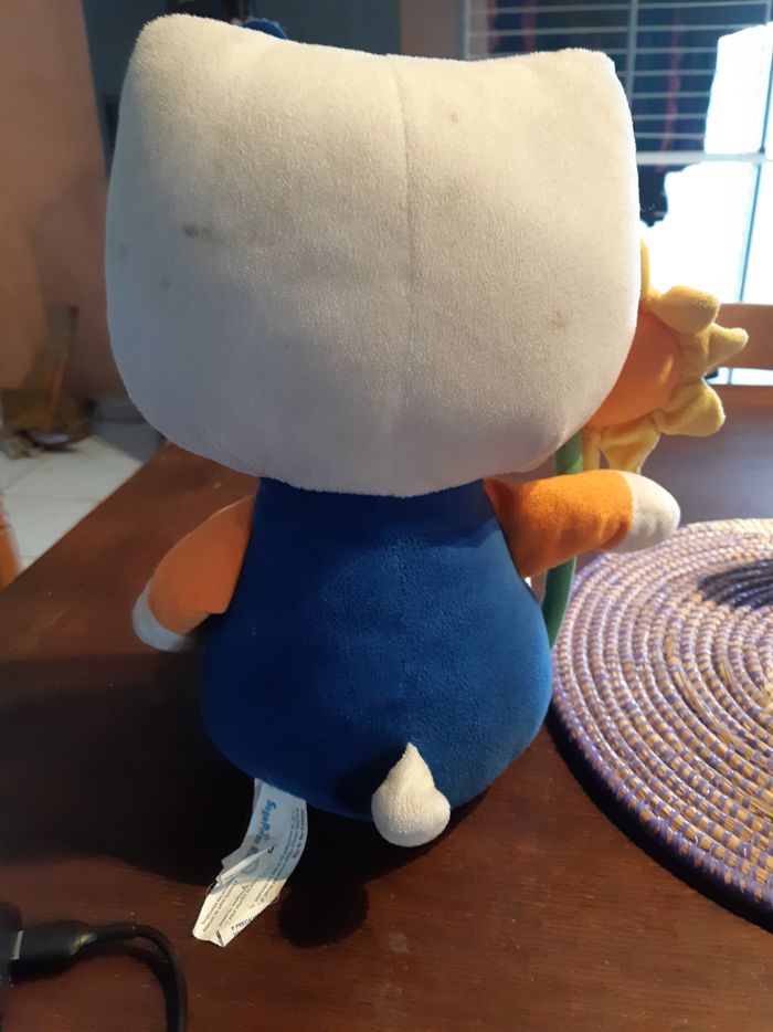 Salopette bleu , la tête blanc une fleur sur la tête, des moustache et une fleur qui tien par la main
