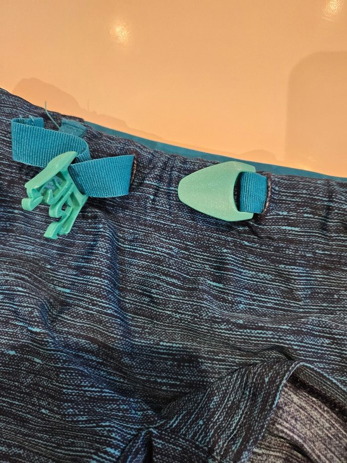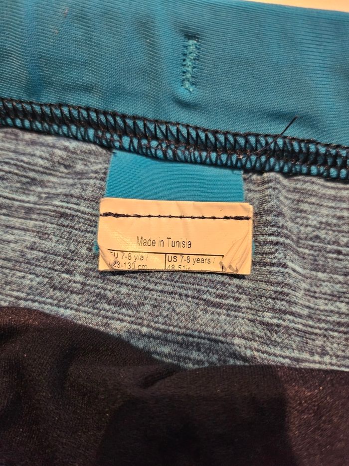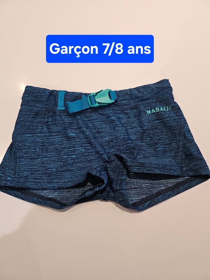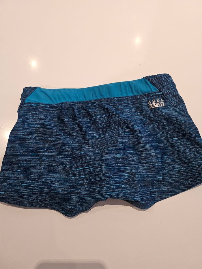 Maillot/boxer de bain. Bleu et noir. Peut se régler à la taille. Marque: Nabaiji Taille : 7/8 ans