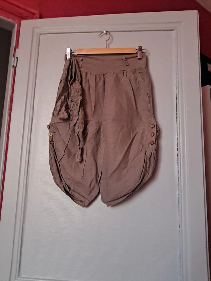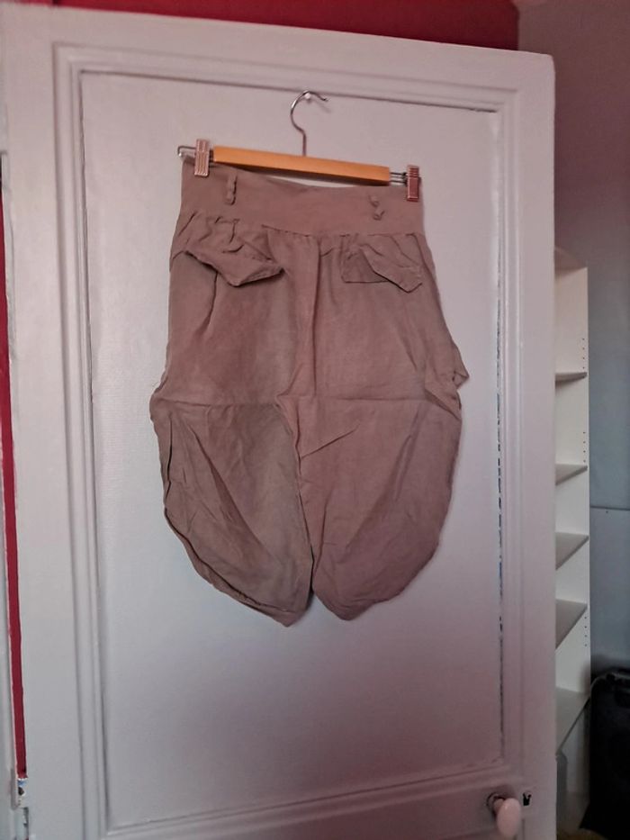 Pantacourt arrive au genoux avec ouverture sur le côté taille m en lin couleur taupe entre le gris et le marron fabriqué en Italie