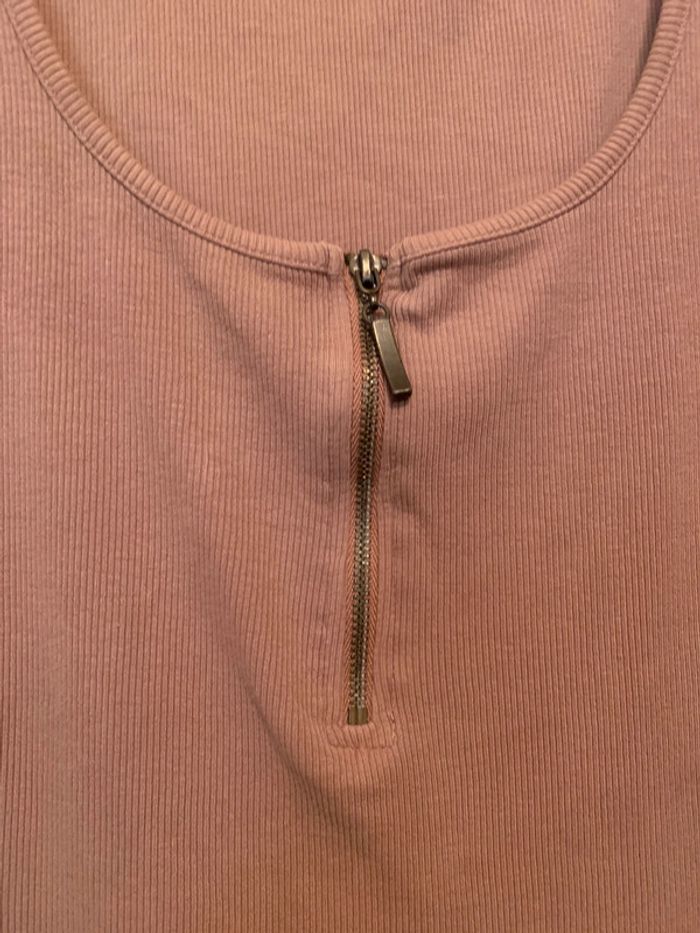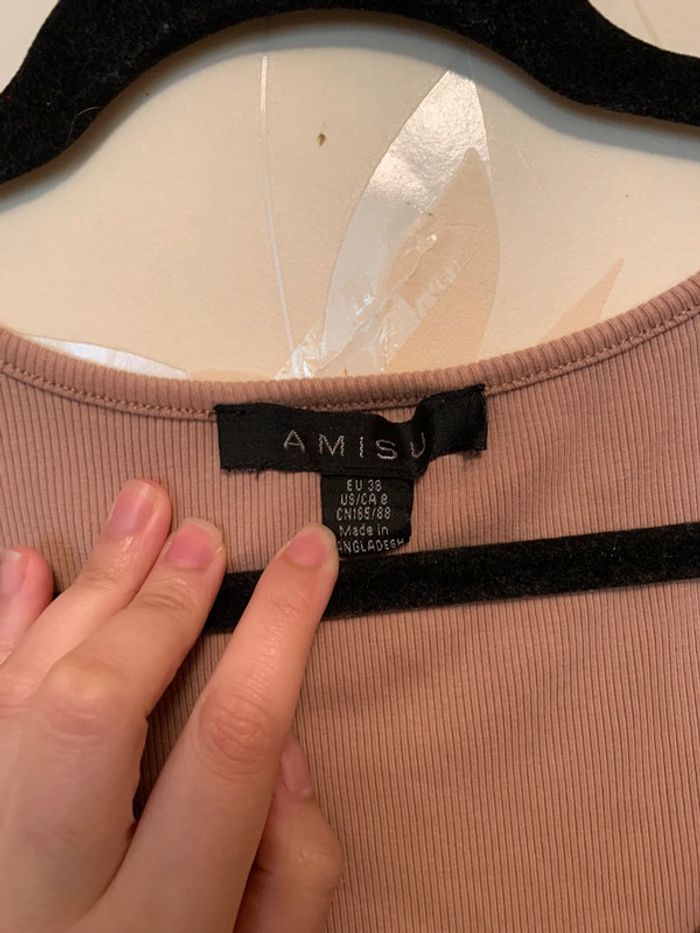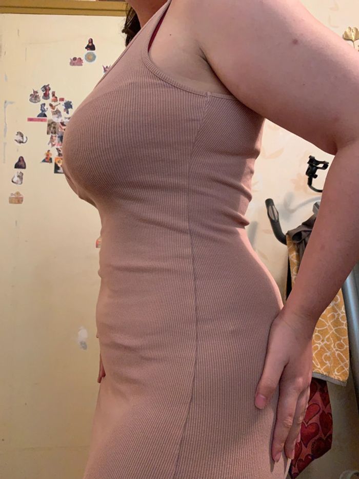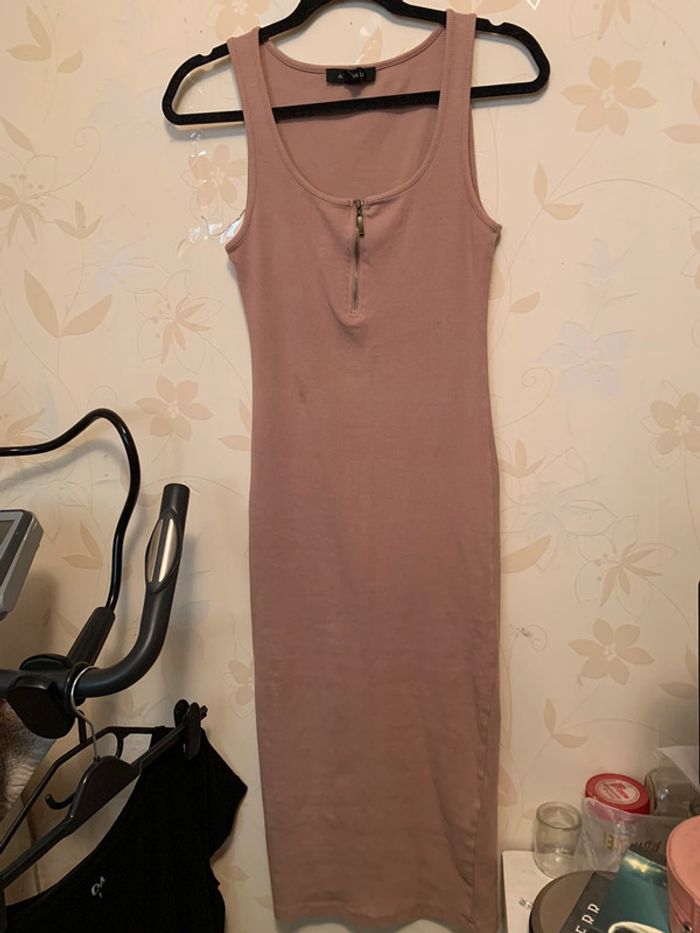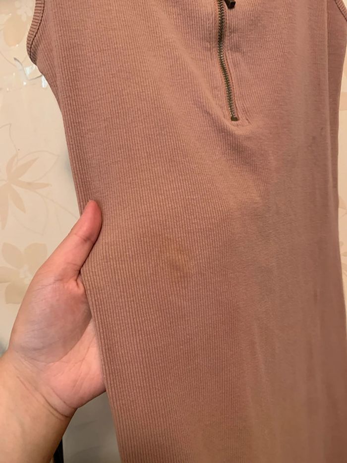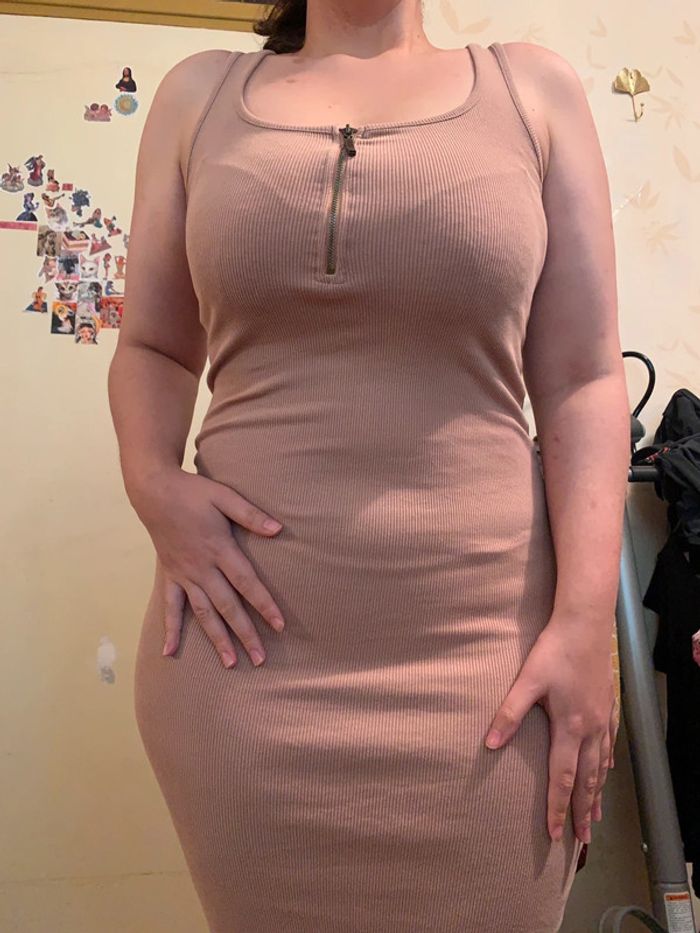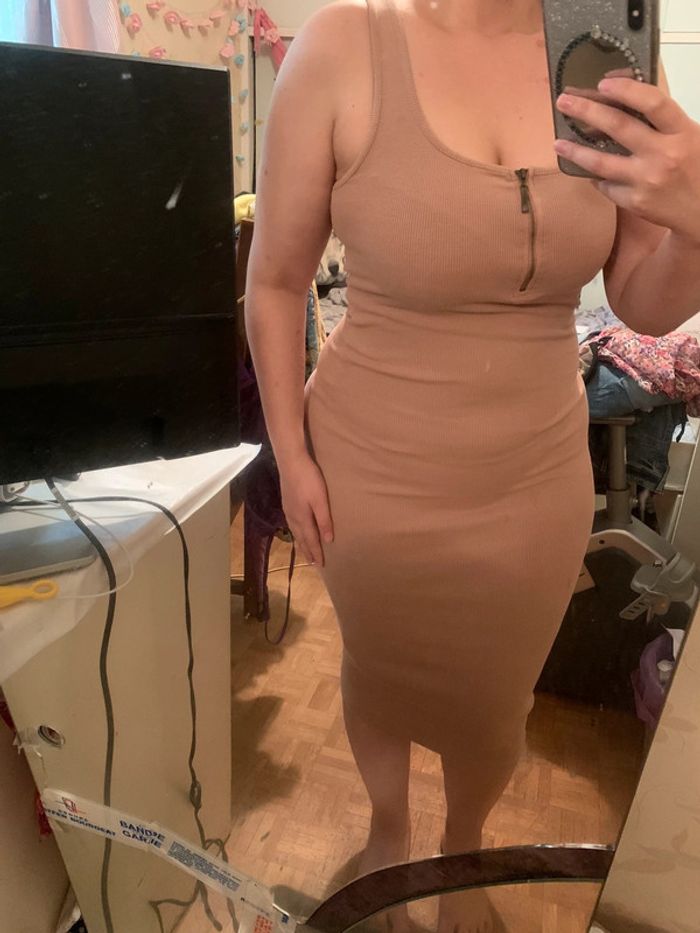 Longue robe moulante de couleur beige avec fermeture éclaire sur le devant. Peut s’ouvrir pour la porter de façon sexy. Matière, côtelée, élastique et confortable. Elle m’arrive juste qu’en bas des genou (je fais 1m56)
