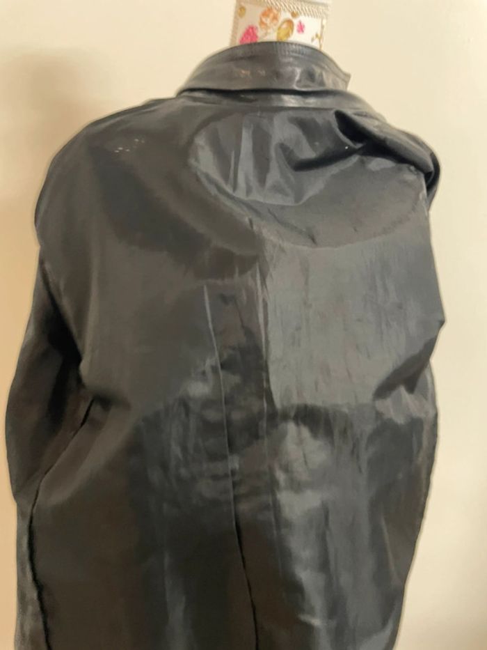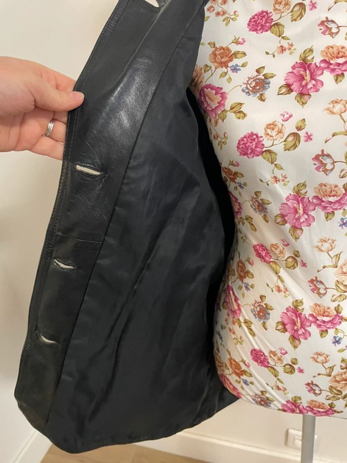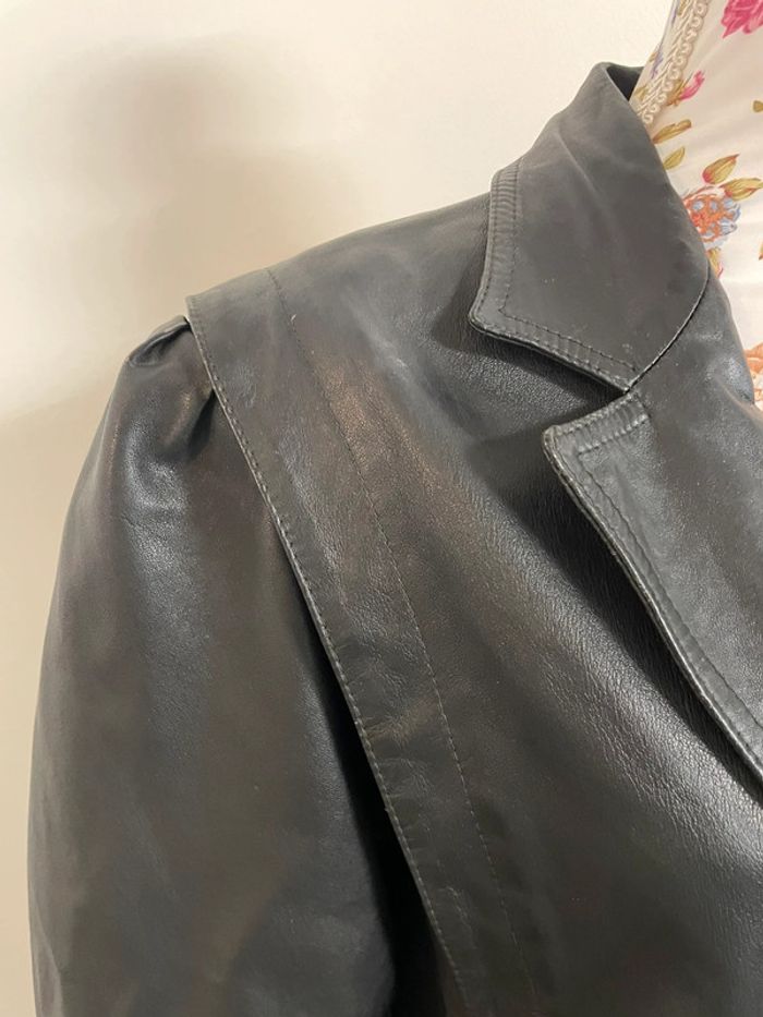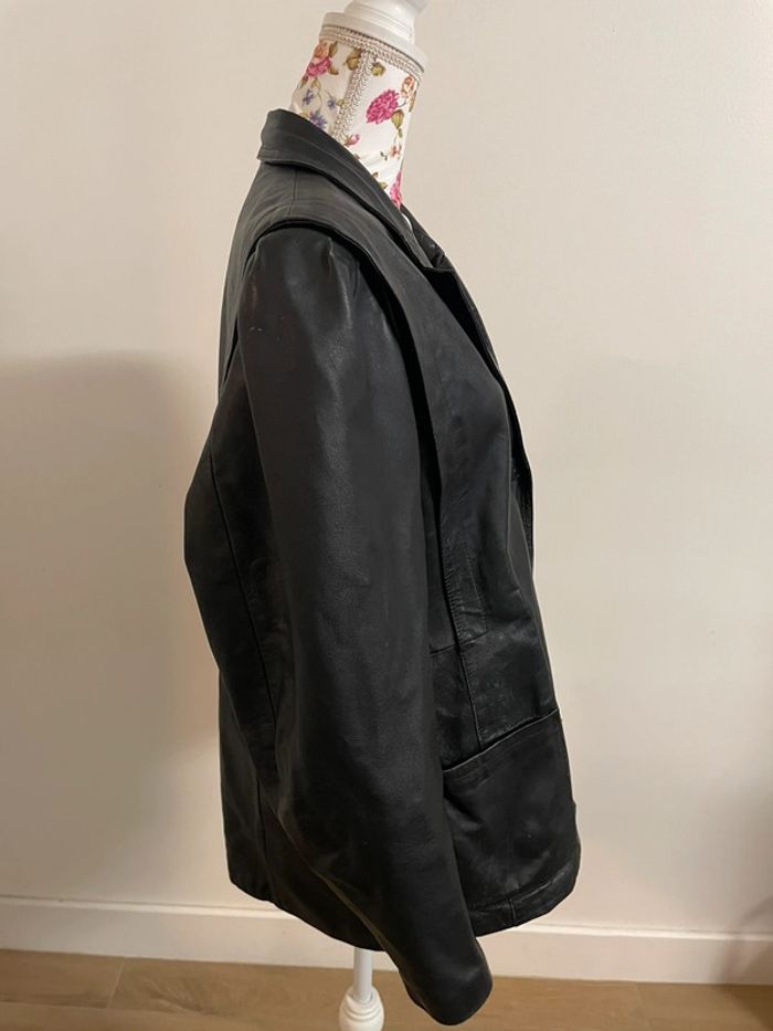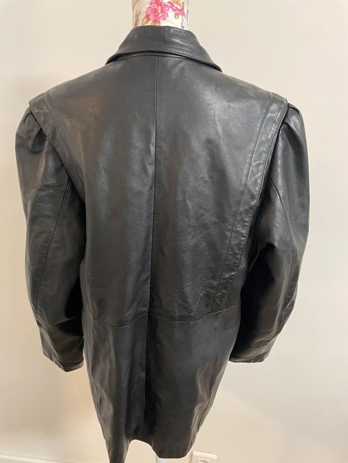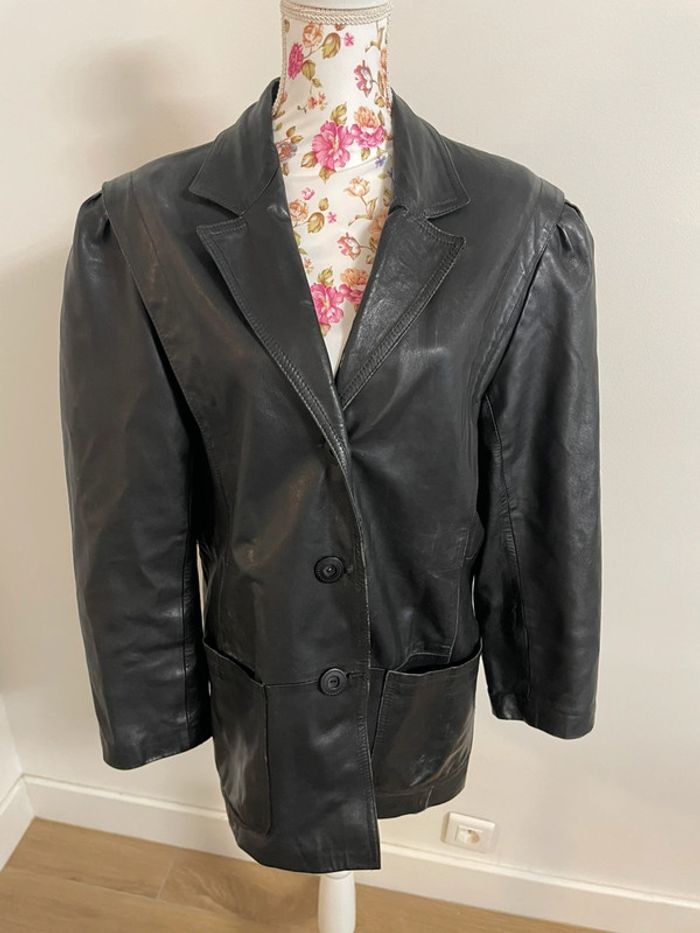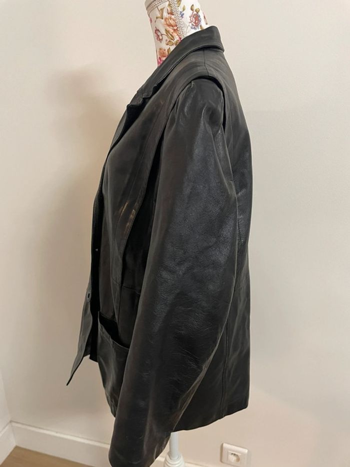 Manteau en cuir des années 90 Couleur noir En très bon état, épaules légèrements bouffantes Dimensions: Épaule à épaule 45 cm Longueur 75 cm