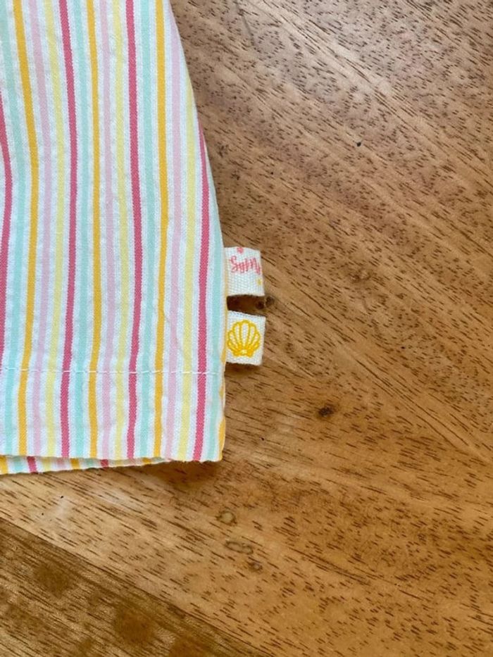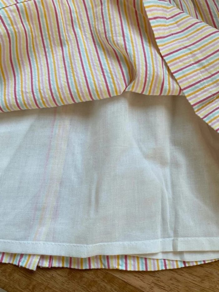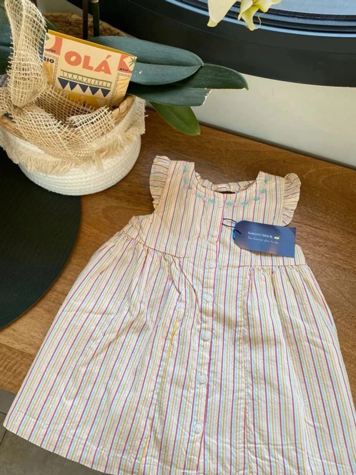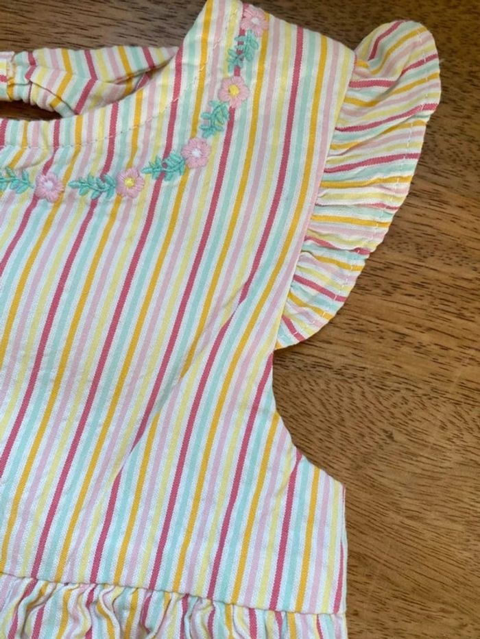 Superbe robe rayée rose jaune et turquoise Brodée sous le col avec des petits boutons coquillage 🐚 en nacre Joli découpe dans le dos, doublée sous le jupon Neuve avec étiquette