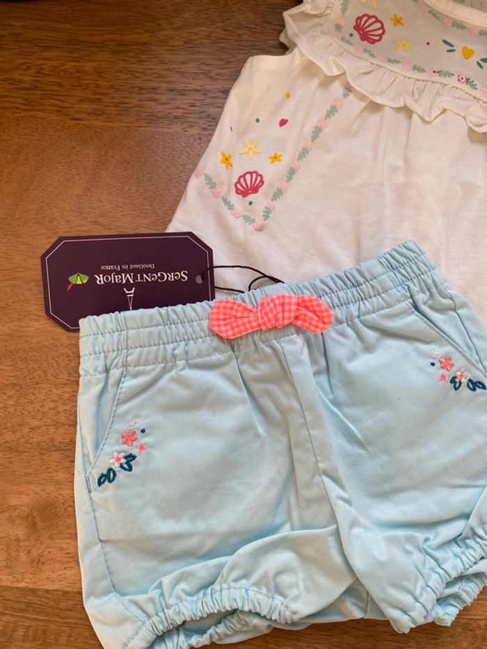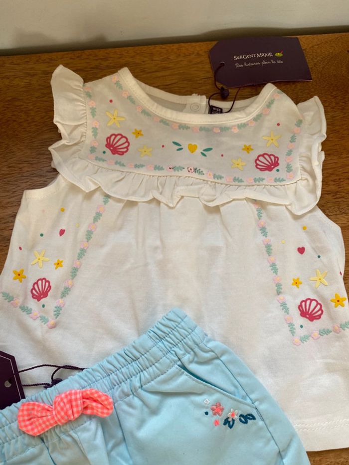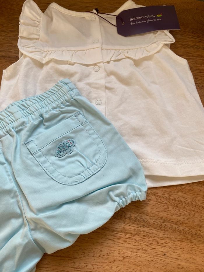 Ensemble Sergent major assorti neuf avec étiquette 🌸 short 3 mois turquoise avec petit noeud rose fluo vichy et broderies sur les poches 🌸 superbe haut 3 mois manches courtes blanc à imprimé, entièrement boutonné dans le dos pour habiller bébé facilement De nombreuses petites choses dans mon vestiaire profitez en pour prendre de l avance sur les saisons et faire des économies !