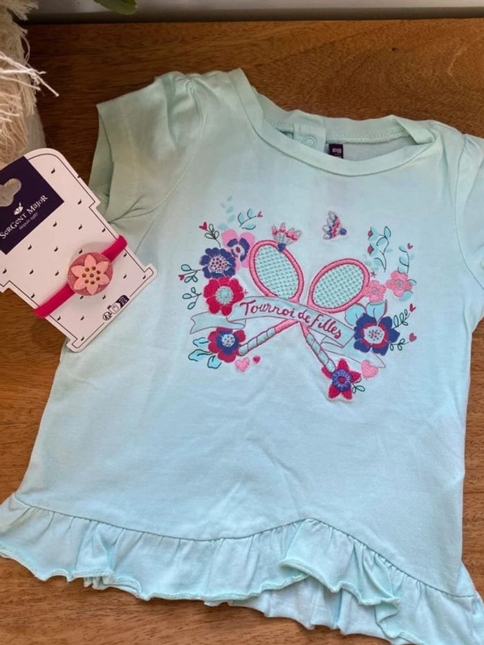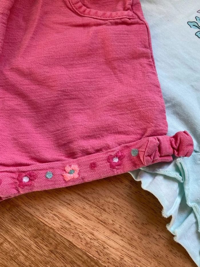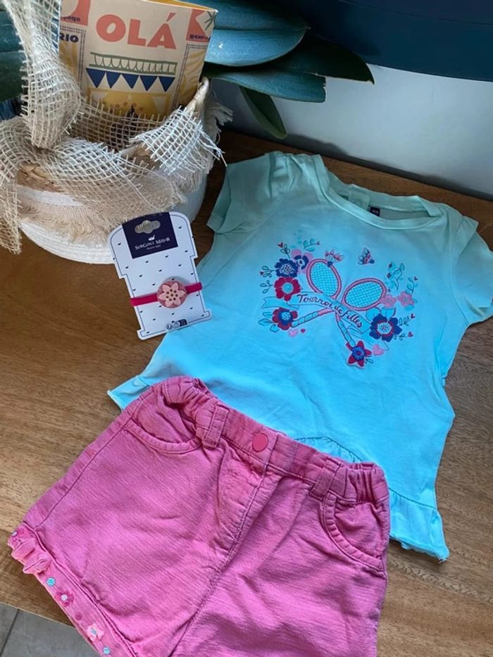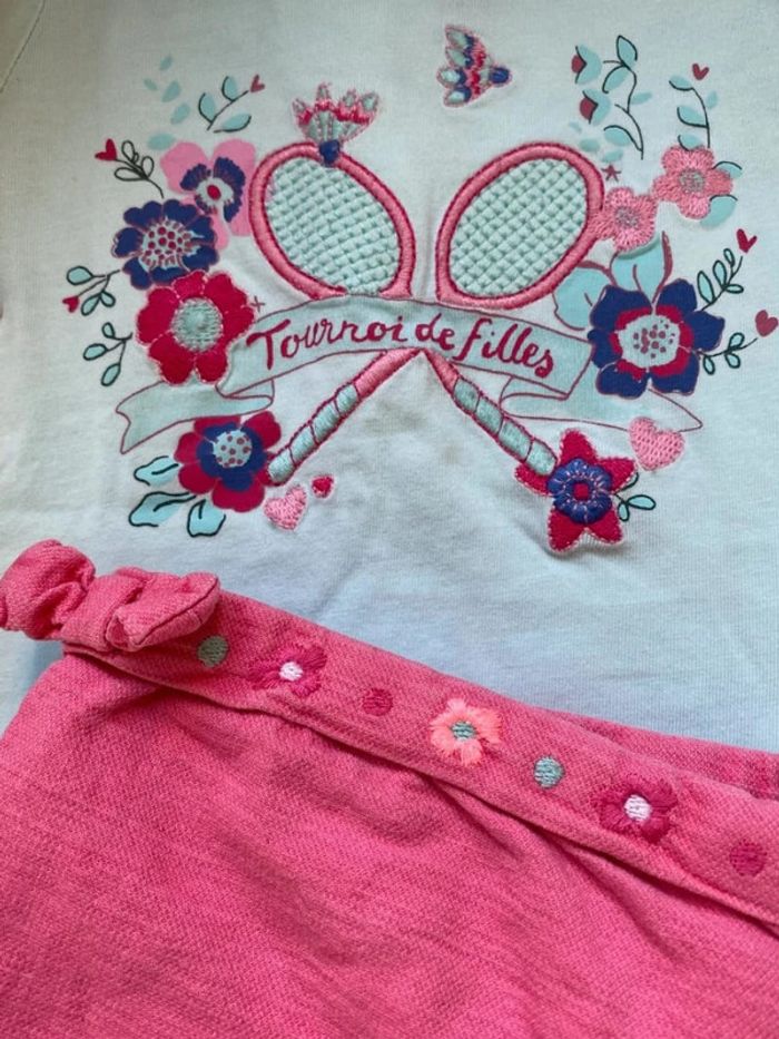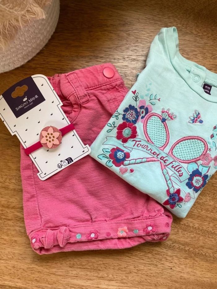 Adorable petite tenue sportive 3 pièces : 🌸 short Orchestra rose brodé de petites fleurs, très bon état 🌸 tee shirt Sergent major neuf sans étiquette, bleu ciel avec jolies fleurs brodées fushia et rose pâle en rappel du short Superbe découpe dans le bas 🌸 élastique sergent major neuf pour finir la tenue