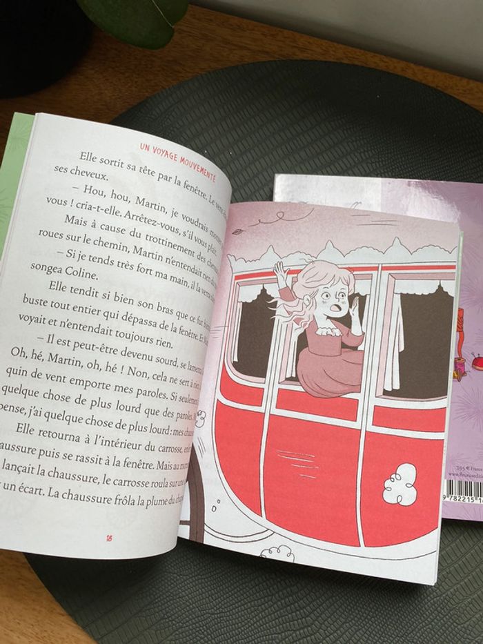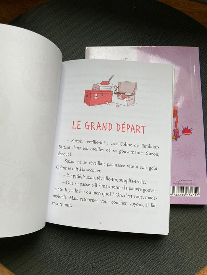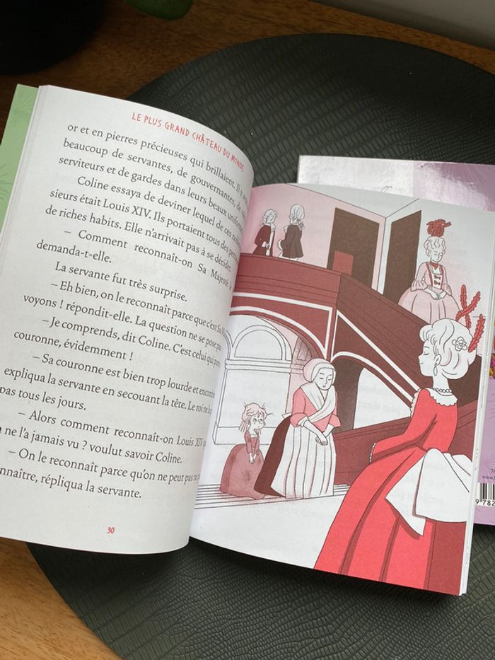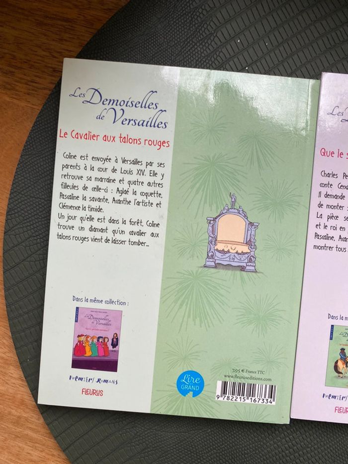 Tomes 1 et 2 Le cavalier de aux talons rouge Que le spectacle commence Coline de Tambour-Battant, neuf ans, est envoyée à Versailles par ses parents, afin d’apprendre les bons usages à la cour de Louis XIV. Elle y retrouve madame du Chêne, sa marraine et quatre autres filleules de celle-ci : Aglaé, la coquette, Pascaline la savante, Acanthe l’artiste et Clémence la timide. Coline est ravie de découvrir la vie à Versailles en compagnie de ses nouvelles amies. Un jour qu’elle est dans la forêt, Coline trouve un diamant qu’un maladroit cavalier aux talons rouges vient de laisser tomber. N’ayant pas reçu la permission de se trouver là, Coline n’ose pas demander l’aide des adultes et se confie à ses amies. Les cinq fillettes se lancent alors à la recherche de l'étrange cavalier dans tout Versailles...