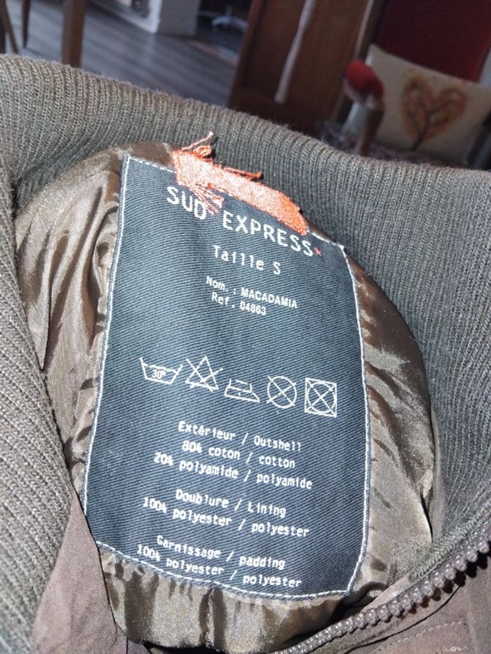 Bonjour, je vends ce blouson de la marque Sud Express taille S en très bon état. Lavé maison non fumeur.