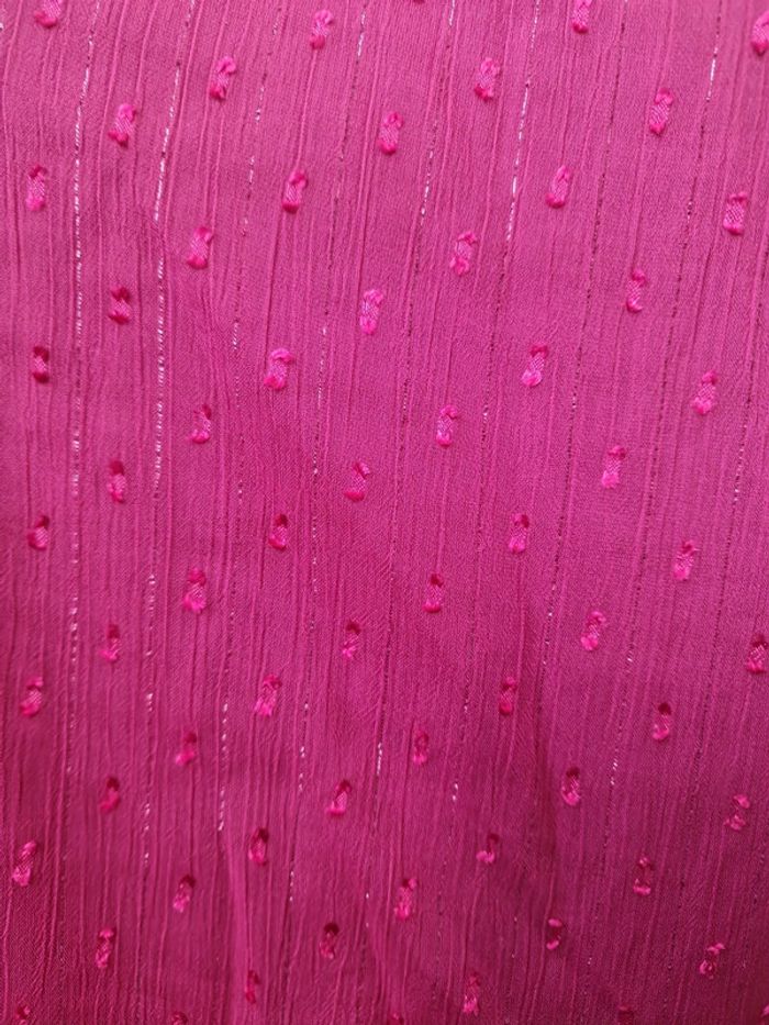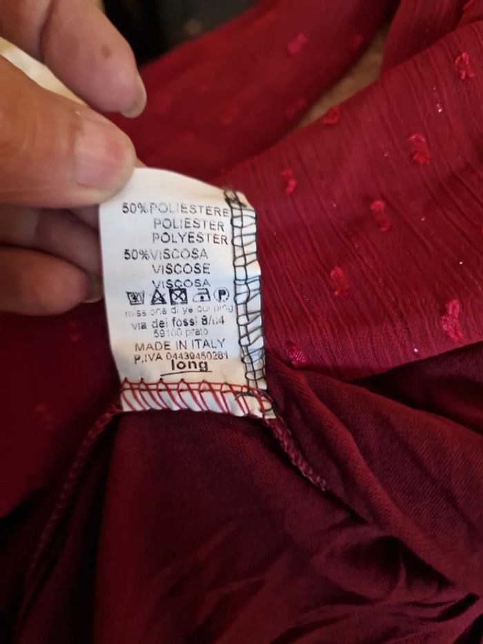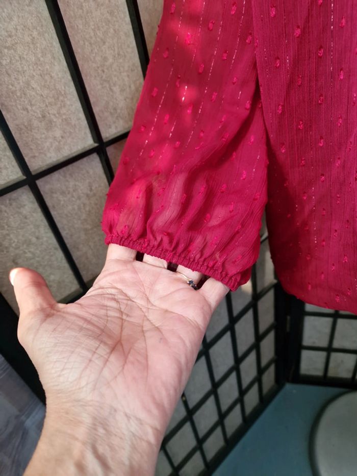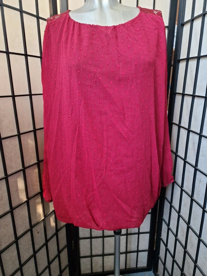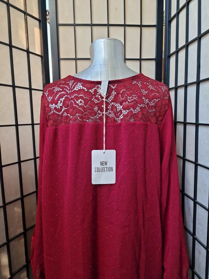 Joli haut voile et dentelle, doublé (donc pas transparent), manches elastiques aux poignets, taille unique jusque bon 44, couleur bordeaux