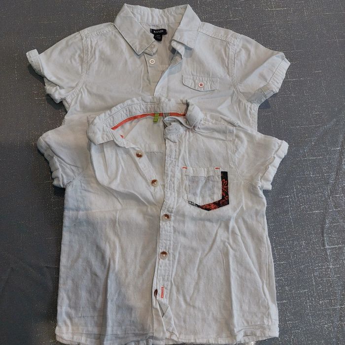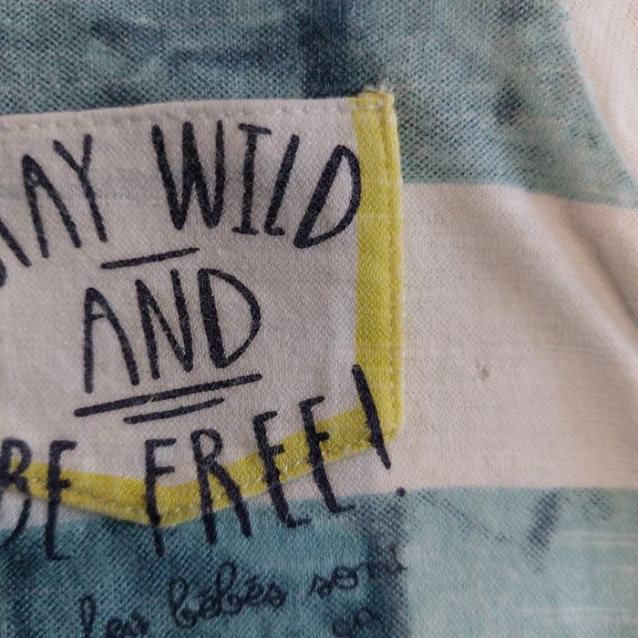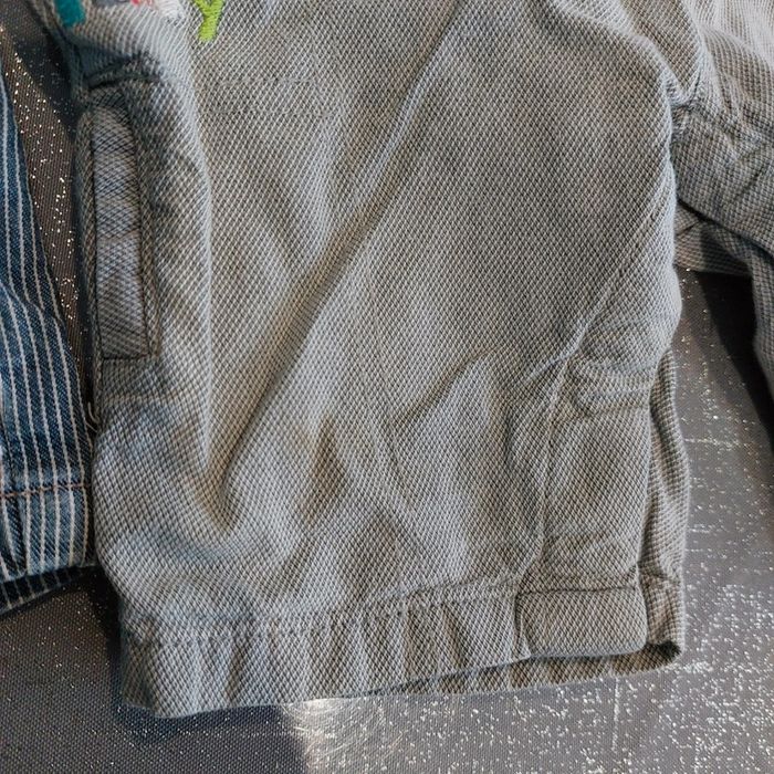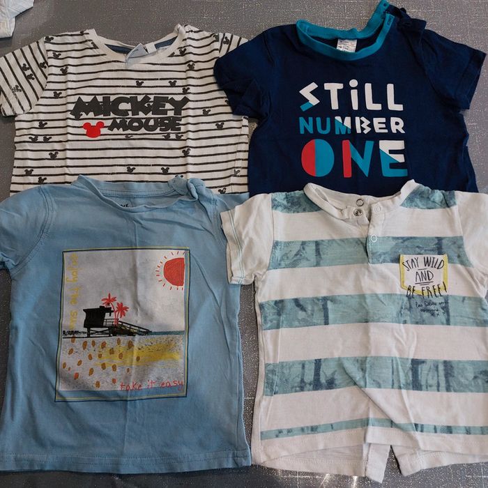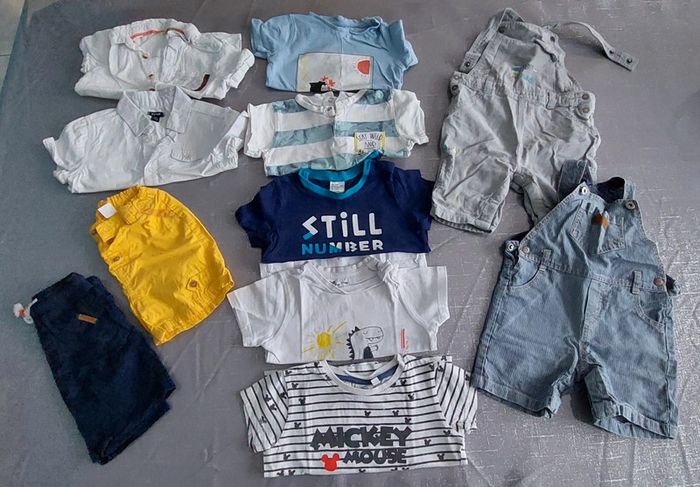 Lot été taille 18 mois comprenant: 5 t-shirts marques Gémo, Les bébés sont comme ça, Mickey Mouse, Domyos Il y a une petite tâche jaune sur la tête du dragon et un petit trou à côté de la poche du t-shirt rayé ( voir photo) 2 chemises marque Kiabi et Orchestra État correct même si souvent portées, sans trou ni tâche 2 shorts marques Gémo et U tout petit En très bon état 2 salopettes marques Orchestra et Nano Nanette État très correct sauf petite tâche brune sur la salopette grise, à peine visible voir photo. N'hésitez pas à faire des lots pour bénéficier de la remise #18moisgarcondecki