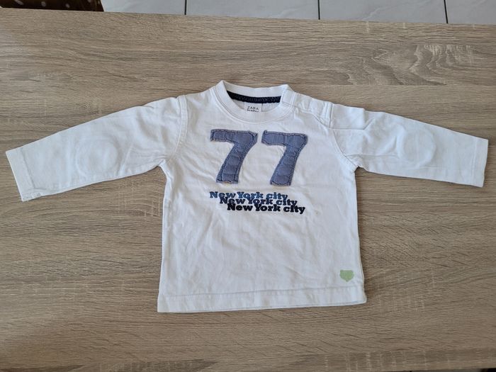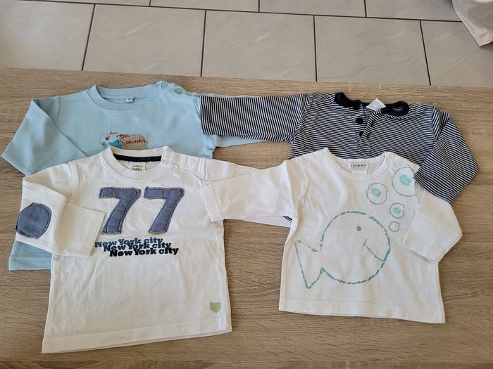 Vend lot de 4 tee-shirts manches longues garçon taille 6 mois juste le Zara baby qui est en 6/9 mois. Lot en bon état juste des petits défauts sur celui Zara (voir photos).