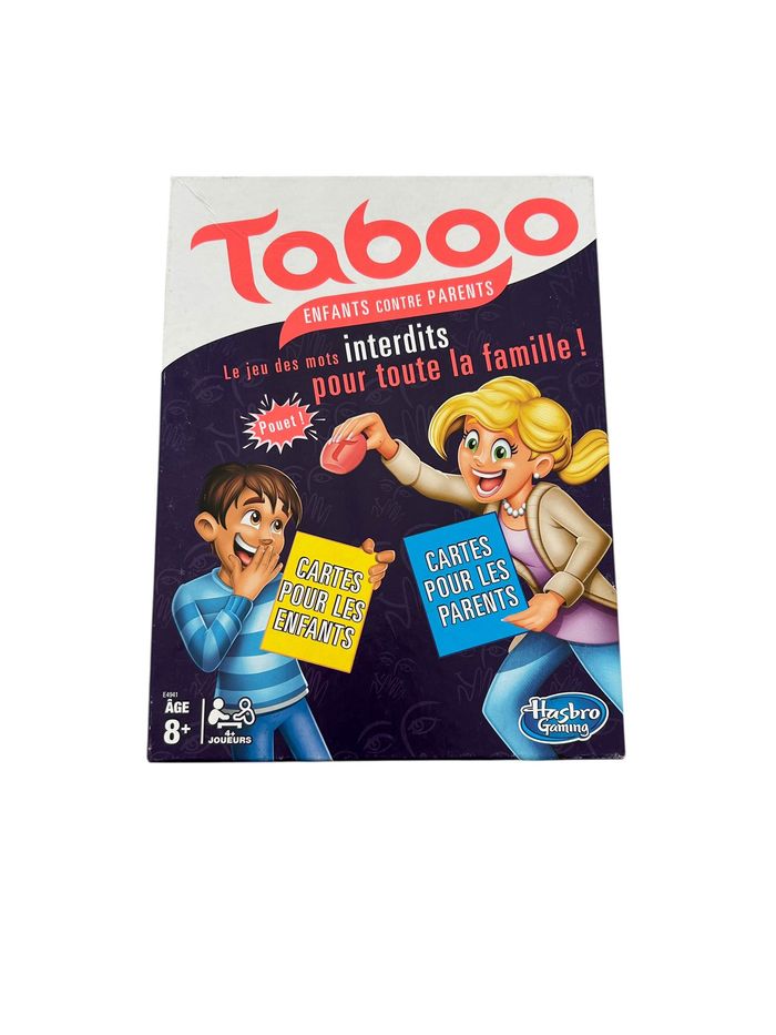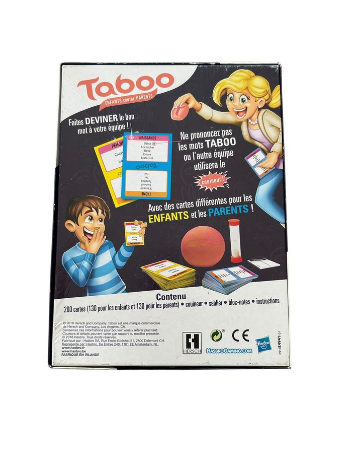 Taboo Enfants contre Parents, une nouvelle version du jeu de société Taboo Classique qui va ravir toute la famille ! Comme dans le Taboo Classique, essayez de faire deviner un maximum de mots à votre équipe en donnant des mots qui ne sont pas dans la liste des mots interdits avant la fin du sablier. Mais attention, si vous prononcez un mot interdit indiqué sur la carte, les adversaires appuieront sur le couineur et ils marqueront le point.