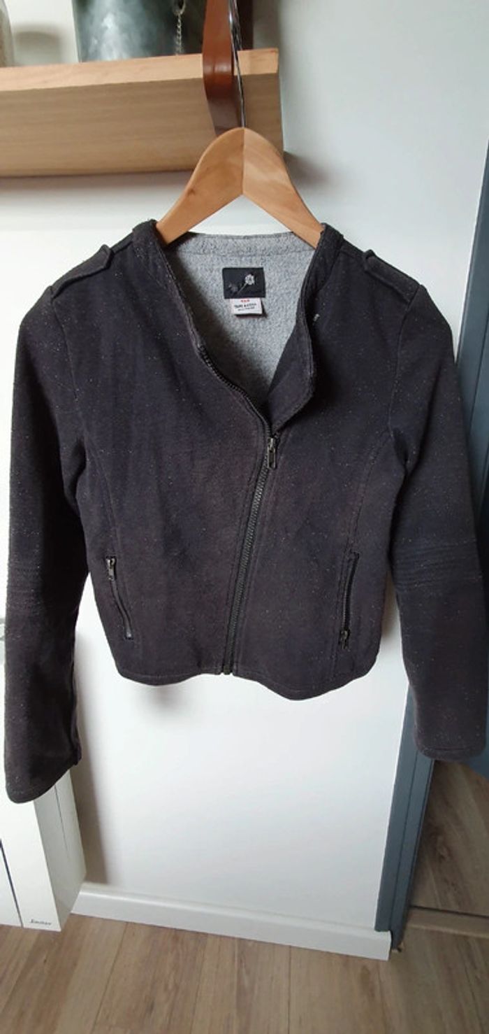 Jolie veste au coloris gris pailleté avec 2 poches zippées. Couleur tissu légèrement passé par endroit mais ne gène pas son utilisation