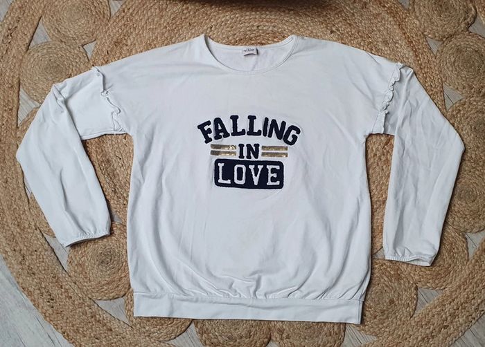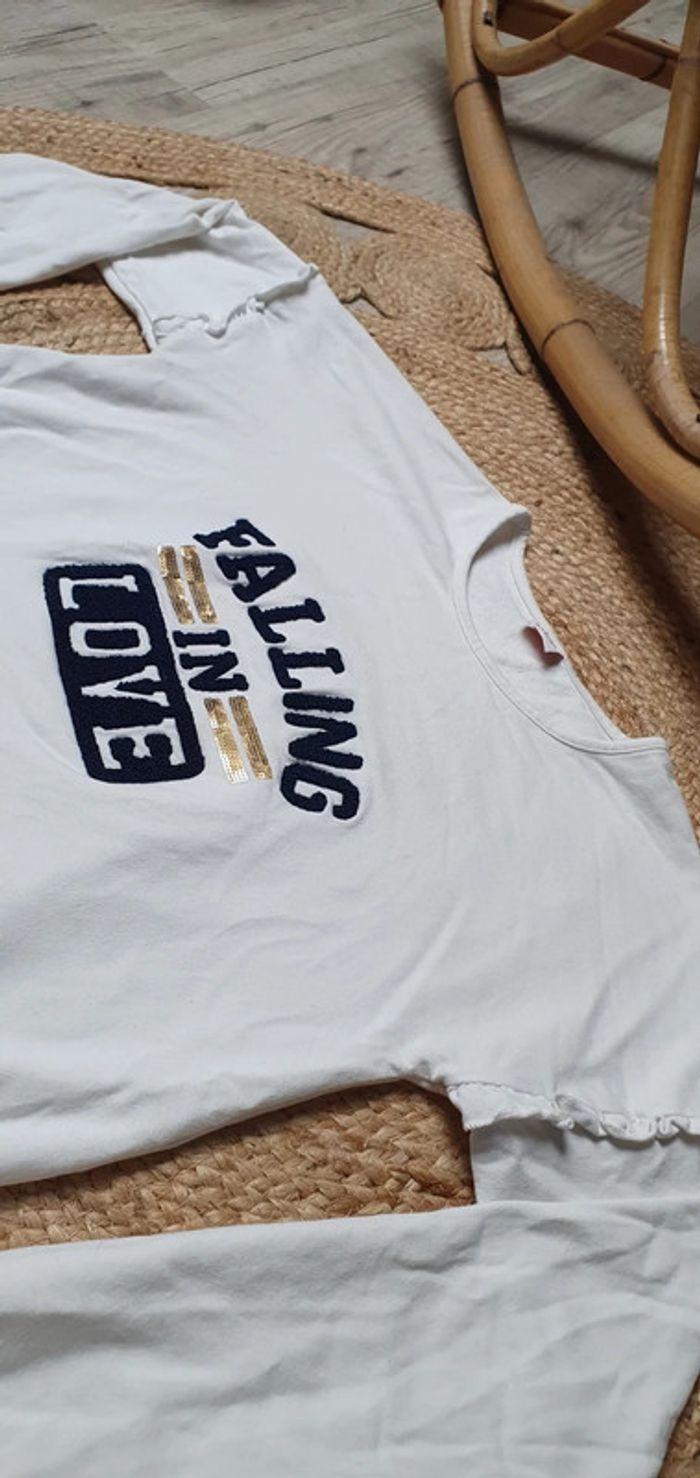 Joli pull très girly avec petits volants sur les manches et magnifique écriture en bouclettes et sequins dorés.