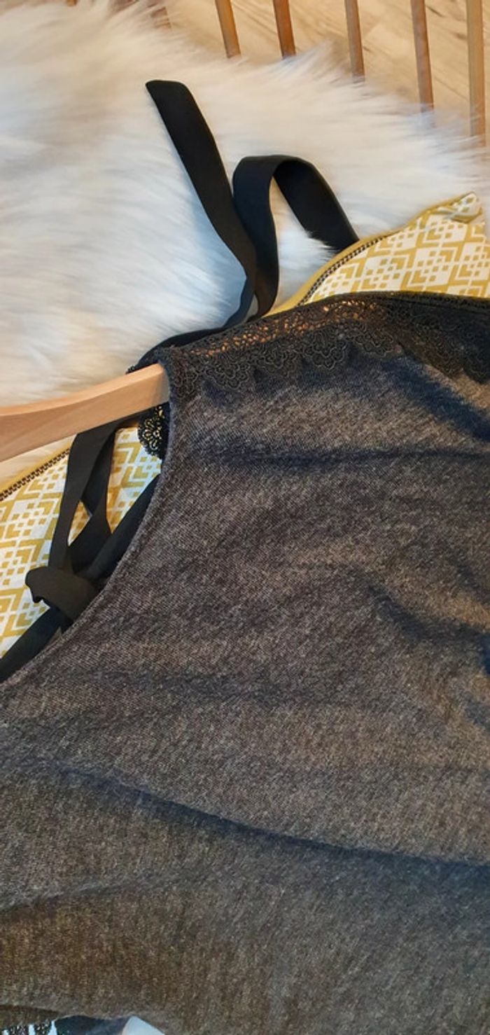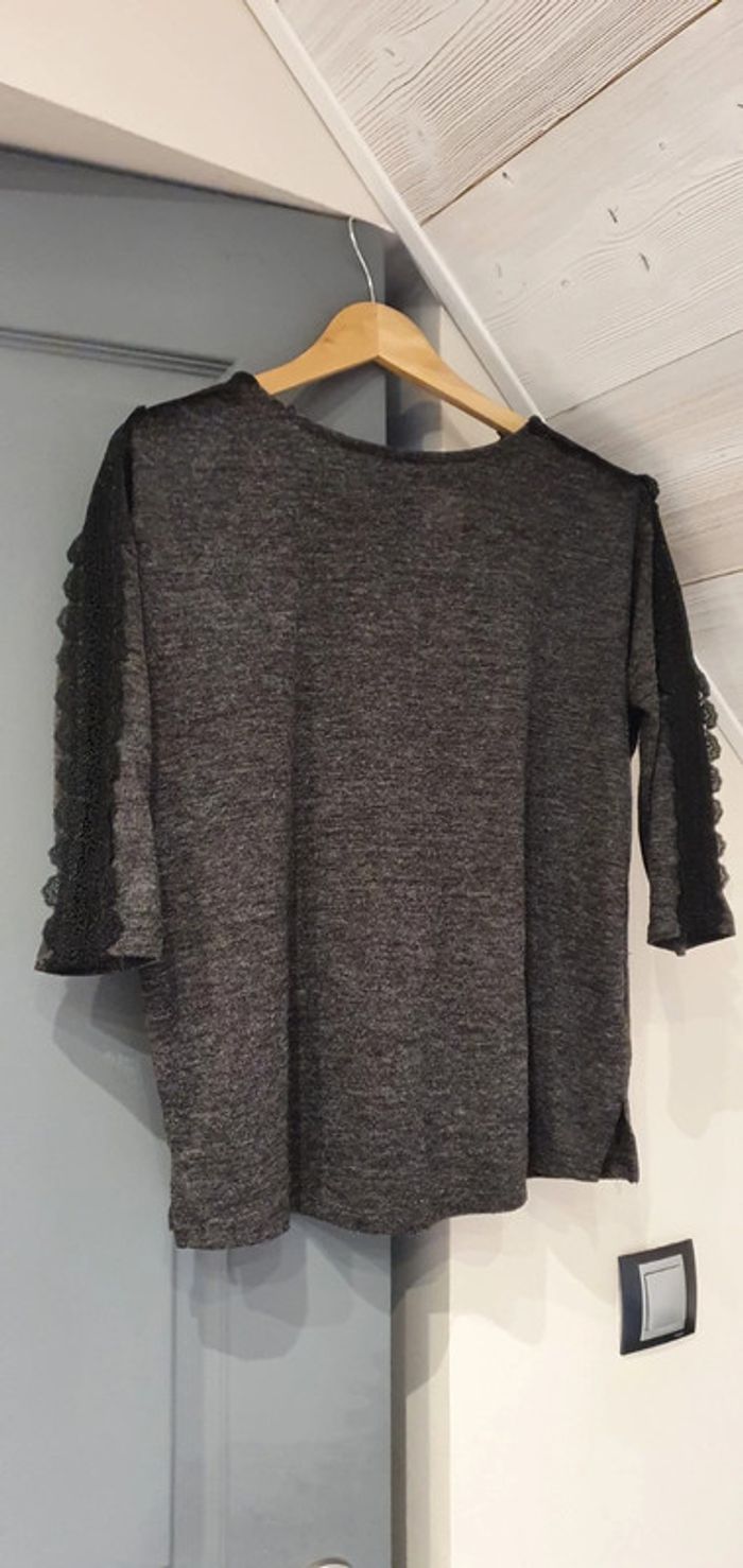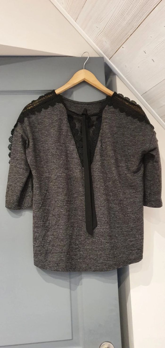 Magnifique t-shirt blousant avec dentelle travaillée sur les bras et dans le dos. Dos ouvert fermé avec liens à nouer. Joli contraste gris anthracite/noir