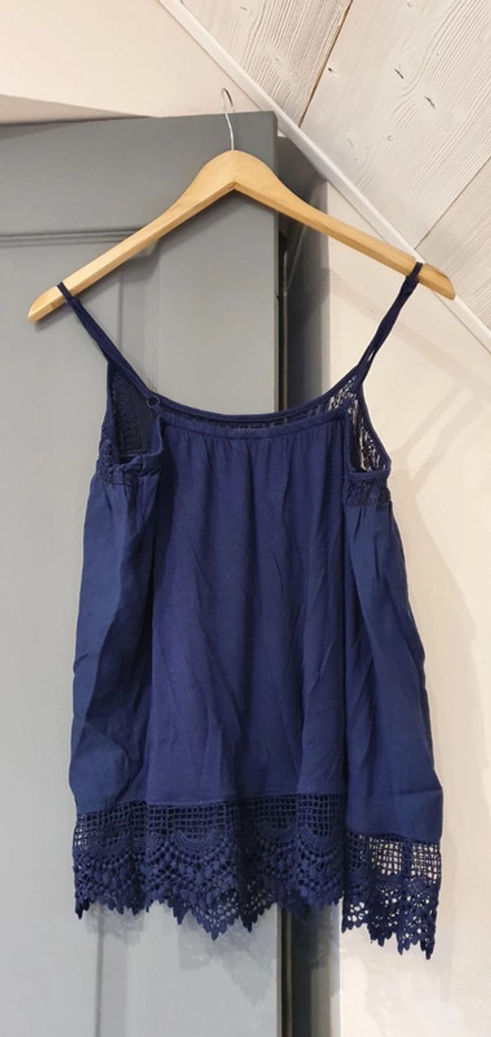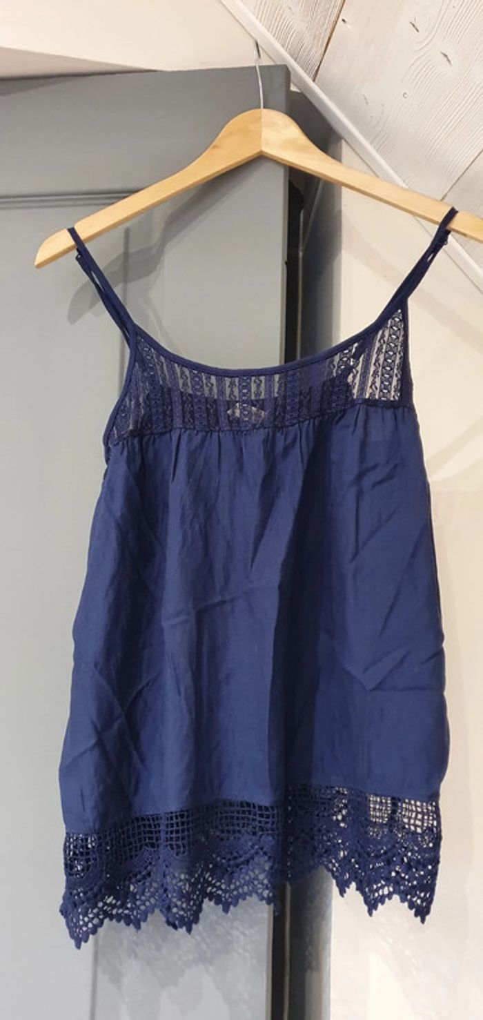 Joli débardeur doux et très agréable à porter. Avec de la dentelle sur le haut et du crochet sur le bas, il est original et très féminin. Bords élastiqués sur le haut. Peu porté
