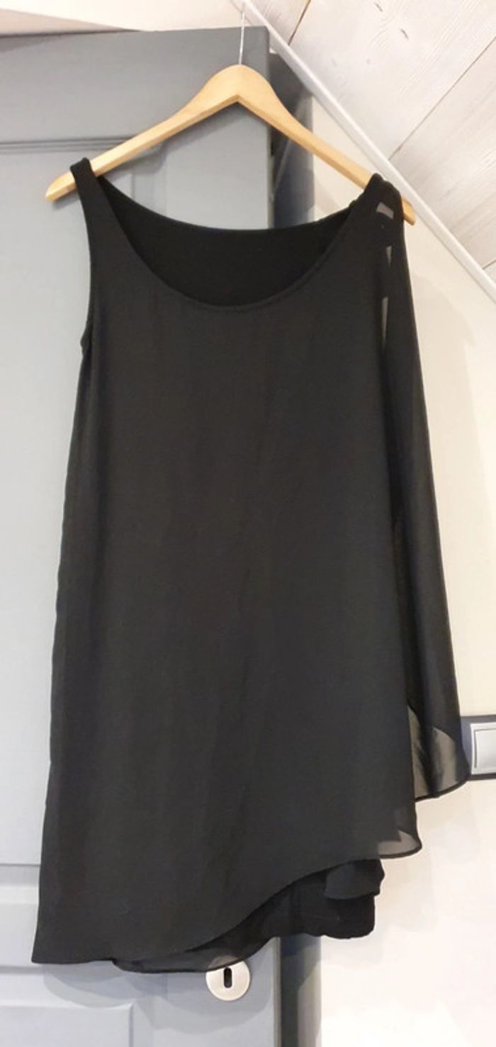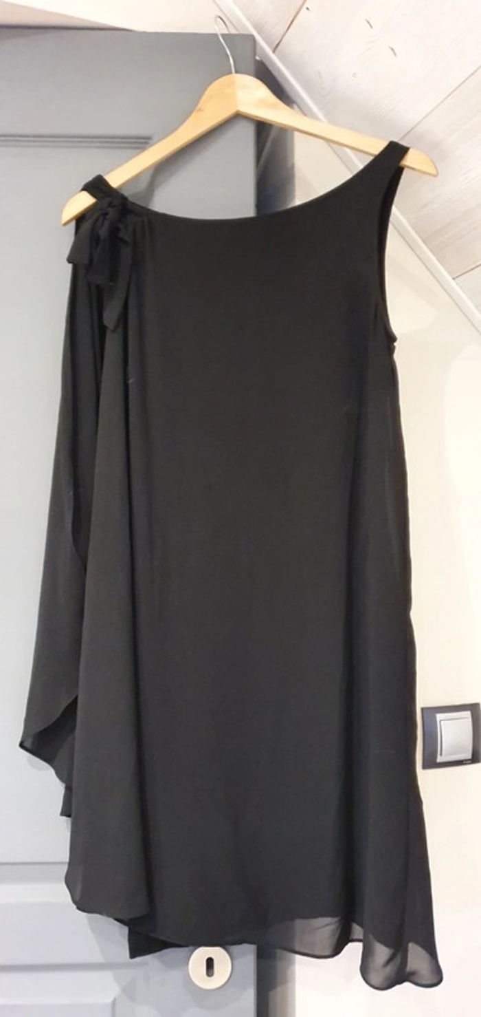 Très belle robe noire chic et fluide, avec une doublure moulante noire recouverte d'un voile style drapée noir. Nœud sur une bretelle. Très bel effet portée