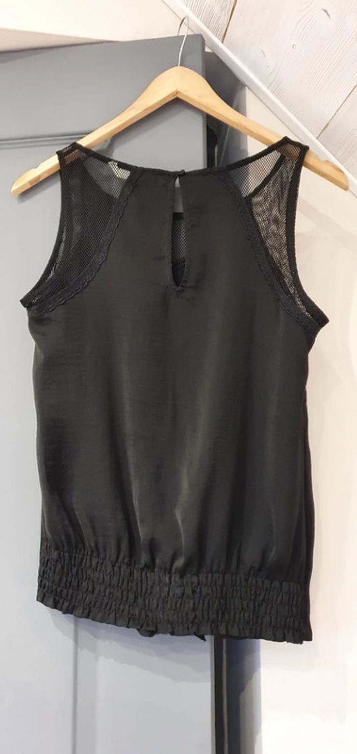 Jolie top blousé resserré et noué au bas. Tissu noir doux comme de la soie. Ouverture goutte au dos. Léger et agréable à porter
