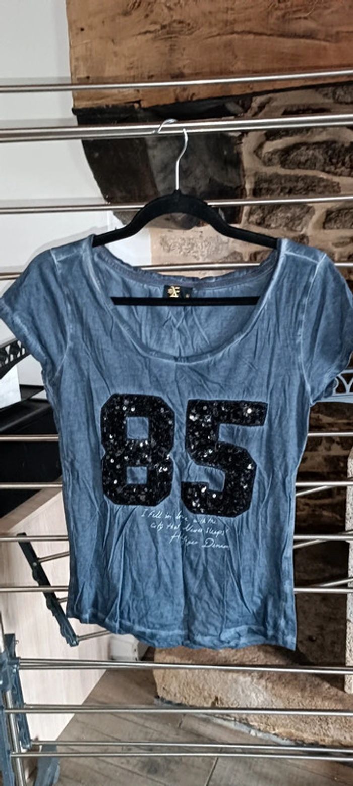 Tee-shirt de la marque fashion express en taille M. Effet bleu délavé. En parfait état. Réduction sur lots activités.