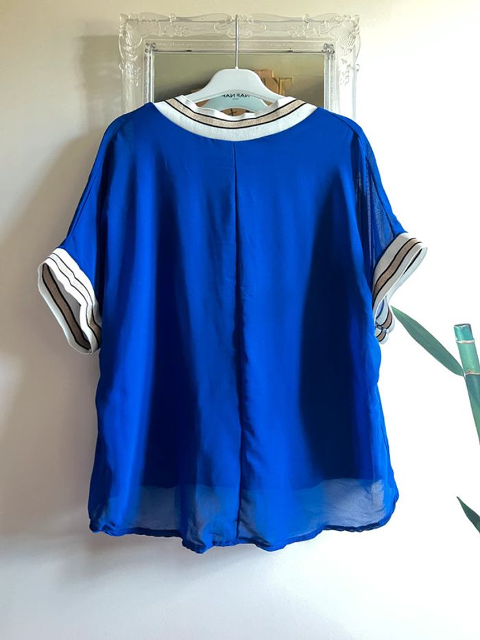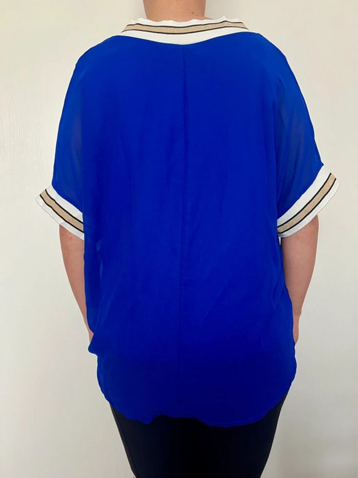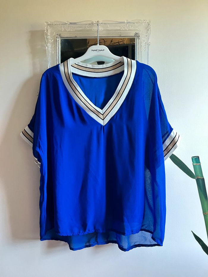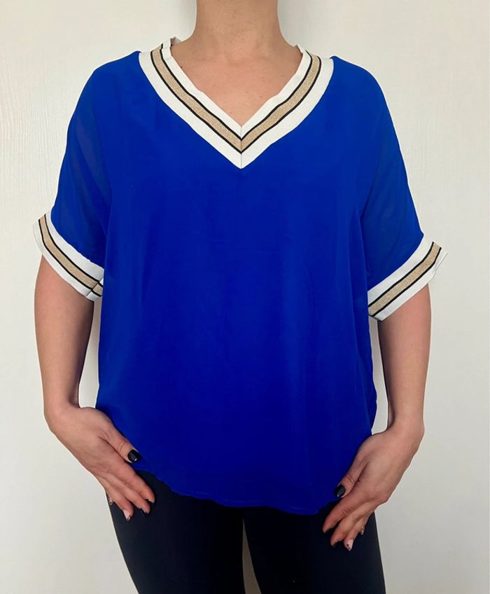 T-shirt bleu avec doublure élastique – Couleur or, blanc et noir – Col en V - photo numéro 1