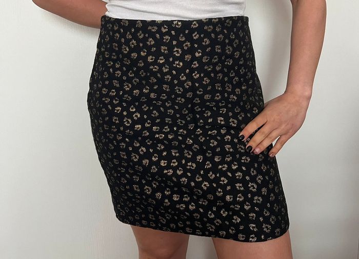 🖤 Jupe noire texturée avec imprimé léopard doré discret mais canon * Fermeture sur le côté droit (invisible une fois portée) * Coupe droite, légèrement moulante * Taille 42 * Parfaite pour une soirée ou un look pro tendance