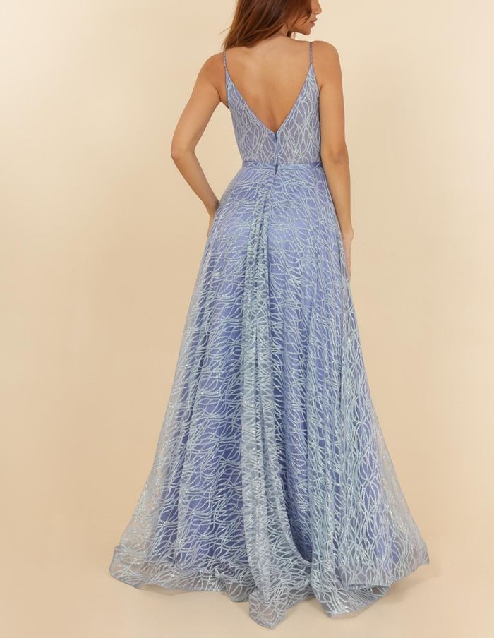 Robe de soirée cérémonie couleur bleu pailleté Fine bretelle perlées  Buste dentelle Décolleté plongeant avec tulle transparente  Coque au niveau de la poitrine pour un meilleur maintien  Fermeture zippé au dos Taille 40