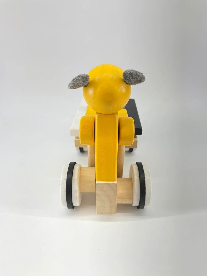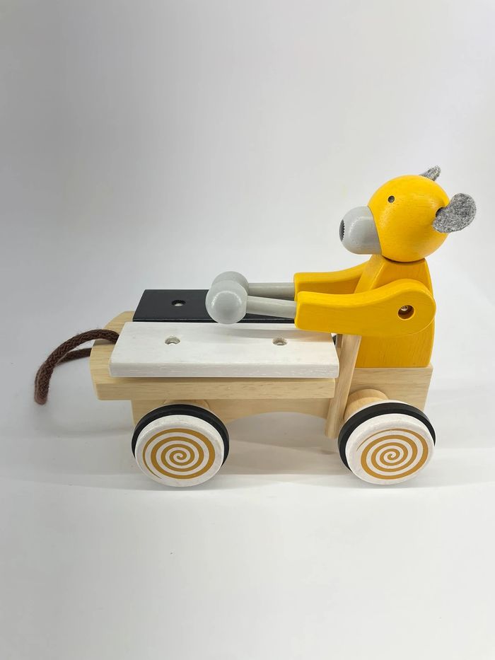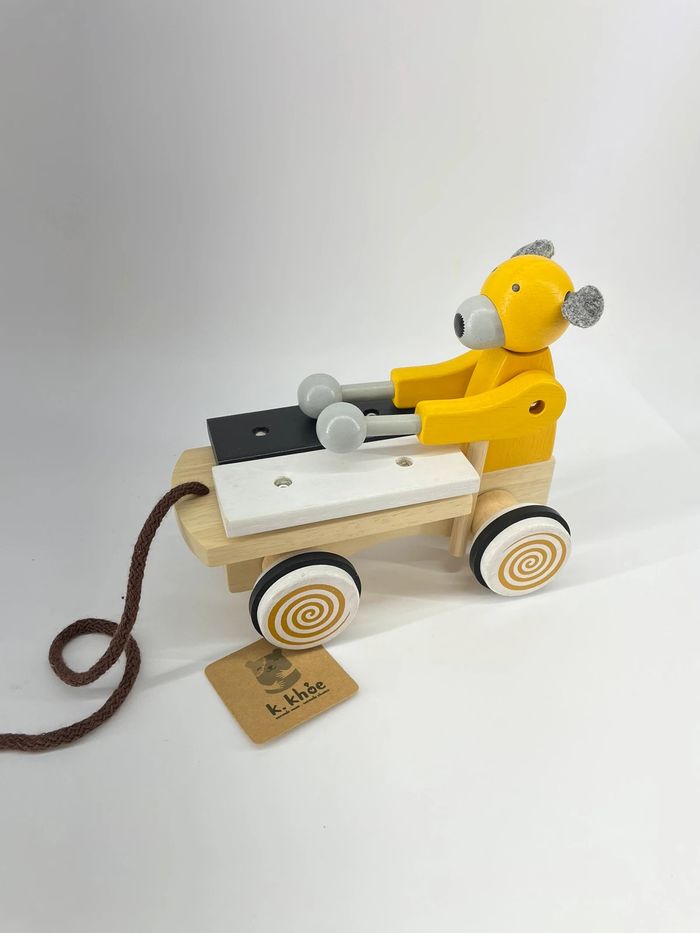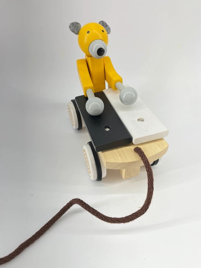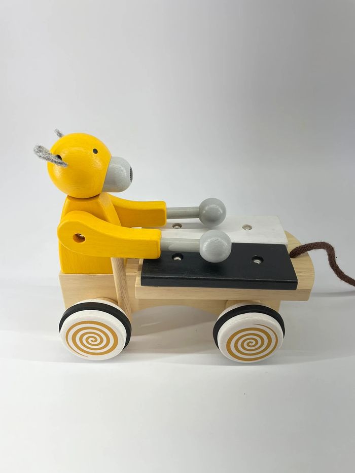 Jouet à tirer avec xylophone, modèle Ours. Le personnage s'anime et joue de la musique lorsqu'on tire sur la ficelle. Développe la motricité Encourage les déplacements Eveil musical Facilement maniable, l'enfant pourra le promener dans toute la maison. Grâce à ses roues avec rebords en caoutchouc, les revêtements du sol seront préservés. De couleurs jaune, gris, noir et blanc, ce jouet intemporel possède une amélioration innovante : son xylophone ! Il suffit de tirer le jouet et l'ours va commencer à jouer du xylophone en levant et baissant les bras. Les jouets à tirer aident l'enfant dans l'apprentissage de la marche. il développe sa motricité et l'incite à se déplacer debout. Dimensions : 20x10x17 cm. Age recommandé par le fabricant : à partir de 18 mois. Valeur Neuf: 40 euros
