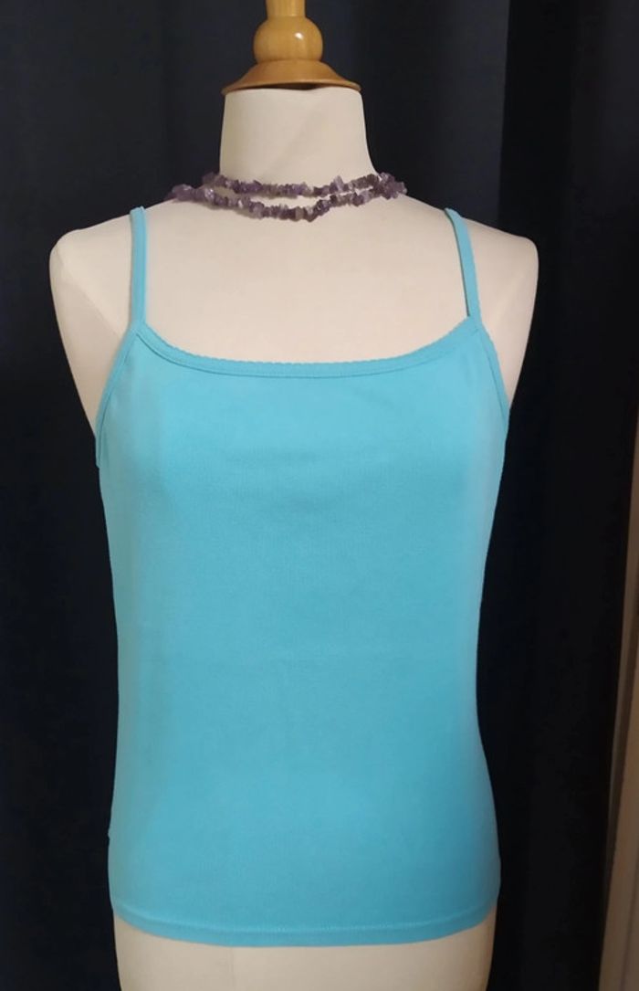 Débardeur bleu turquoise, 37 cm sous aisselles, sans tâches ni accro.