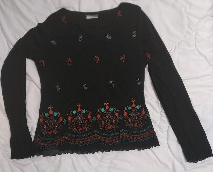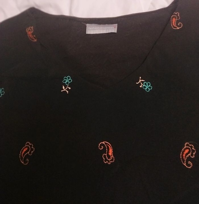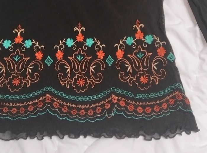 Très joli haut fluide légèrement transparent brodé. Longueur 58 cm Longueur manche de l'épaule 66 cm