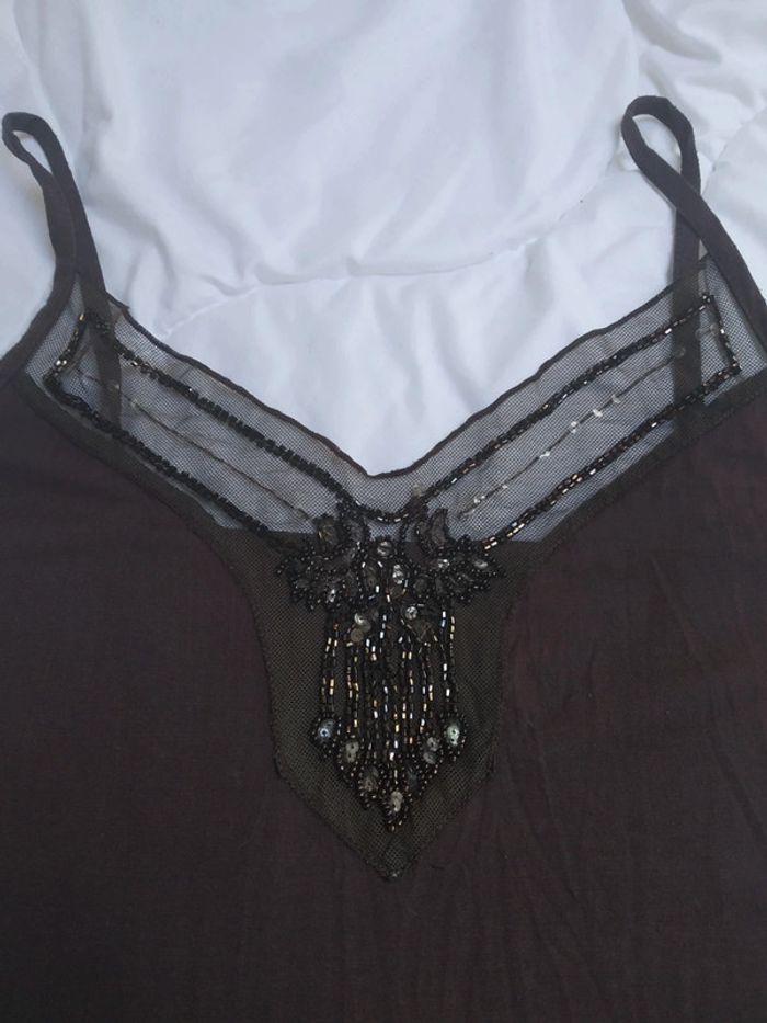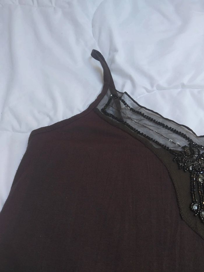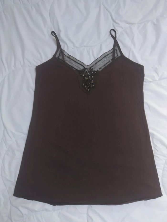 Débardeur marron chocolat avec des paillettes porté quelquefois. Taille m Longueur 58 cm