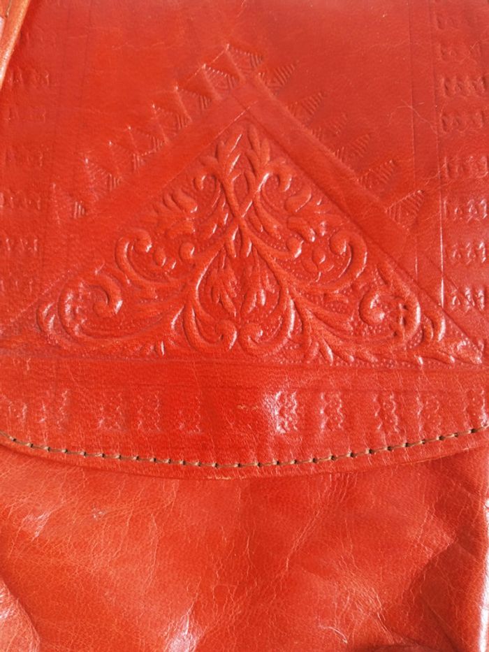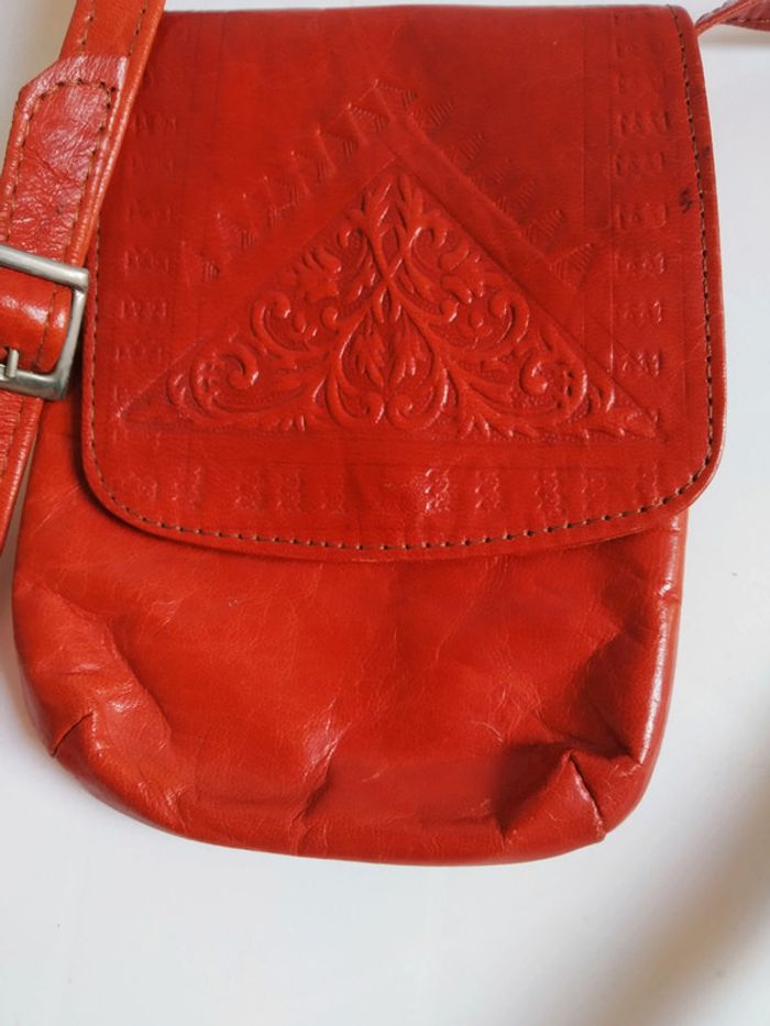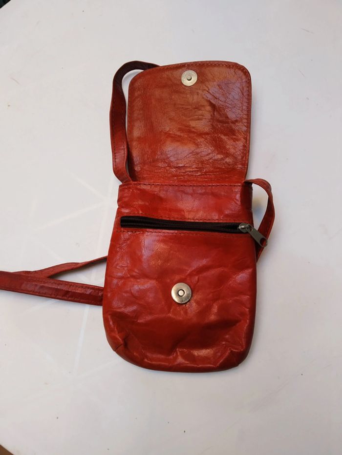Petite pochette 18cm de haut, en cuir, 1 grande poche intérieure plus 1 petite à l intérieur plus une autre poche à l extérieur avec fermeture éclair. Bandoulière 55cm