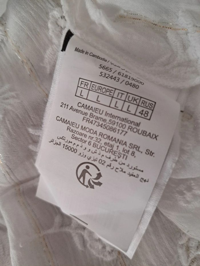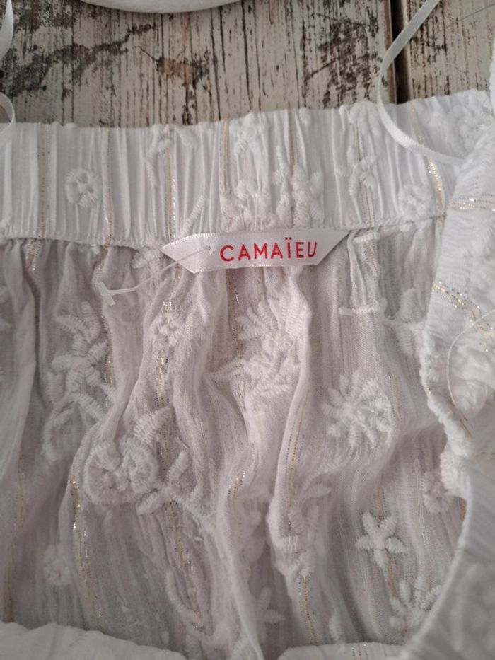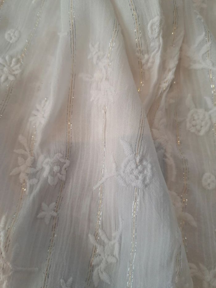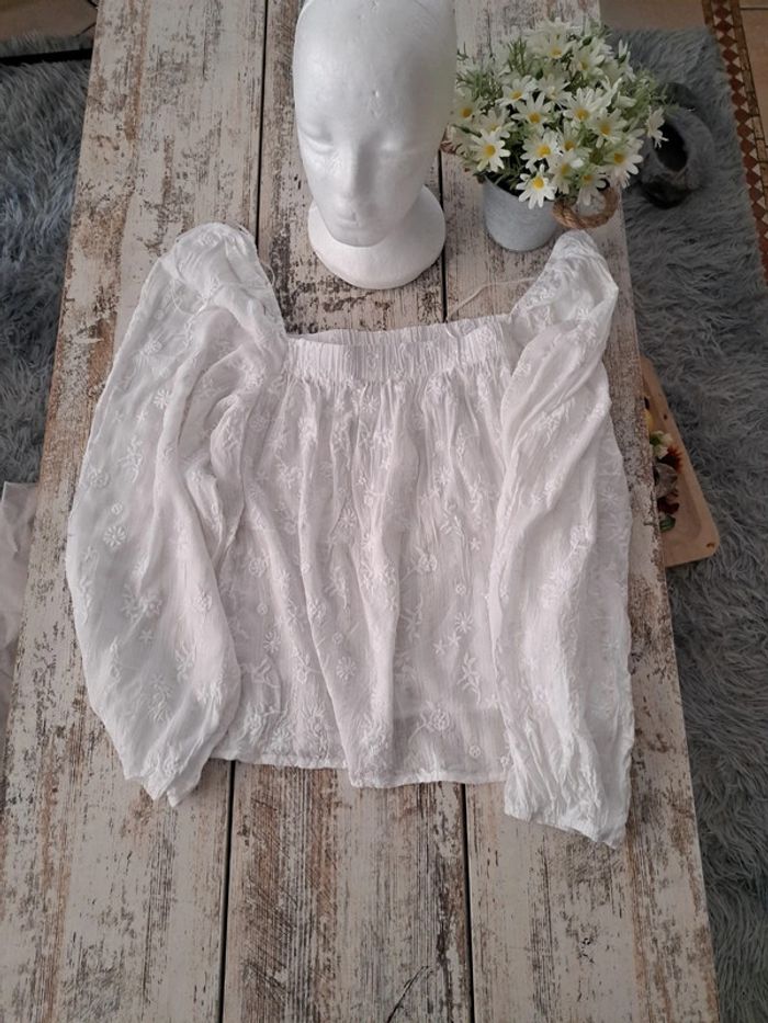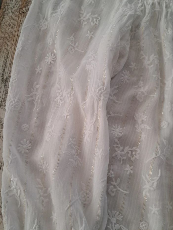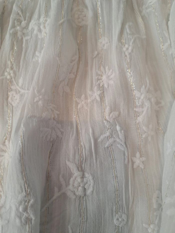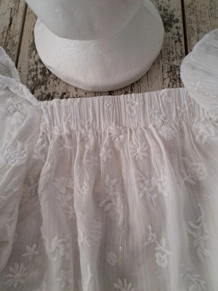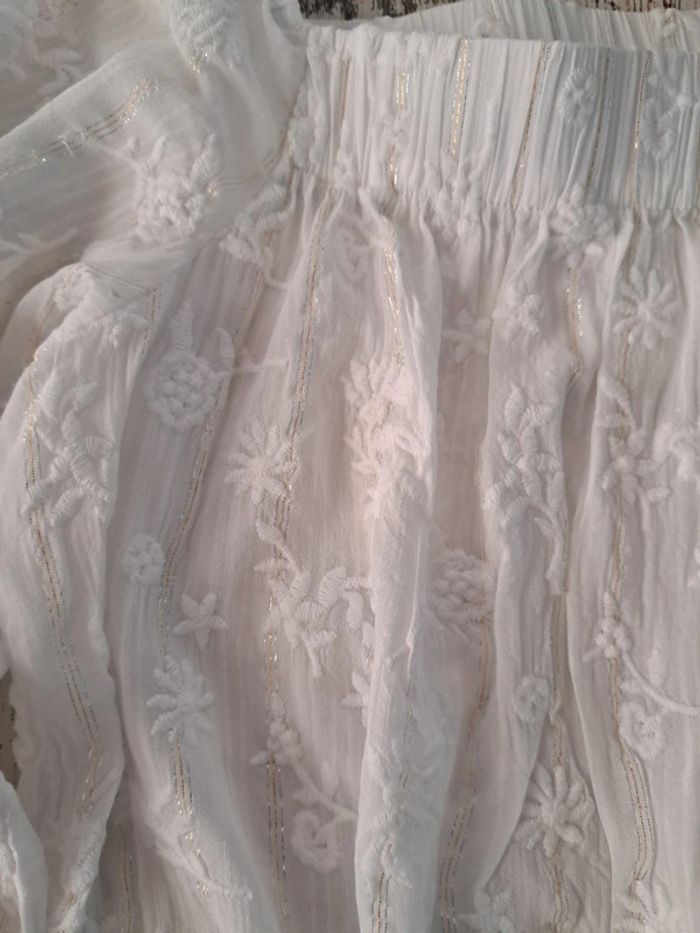 Très joli haut on peut le mettre en épaule nu où se cacher les épaules manches un peu blousante bouffante avec des petits motifs fleuris et un petit liseret de fil doré dans le tissu qui apporte de la lumière et de l'éclat très bon état porter une fois pas d'envoi vintage go