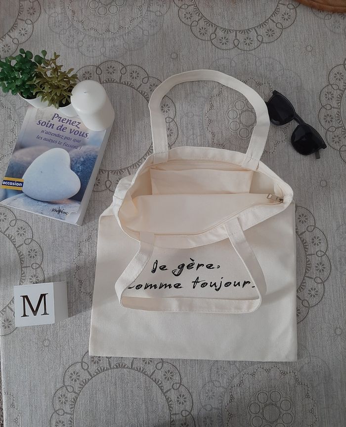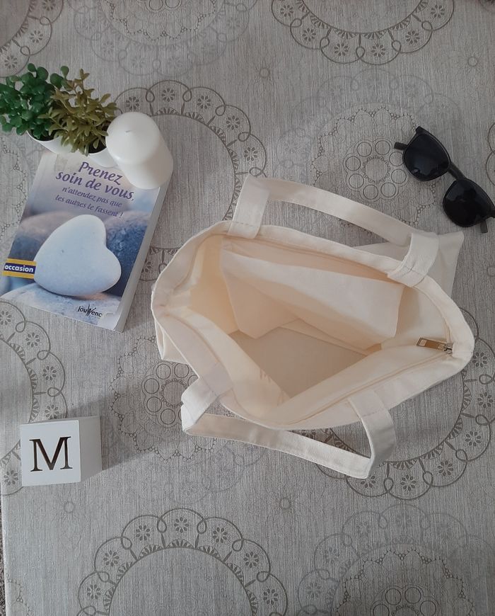 tote bag en coton,solide, stylé et pratique. Couleur beige , avec une fermeture zippée + poche intérieure pour tout garder en sécurité. Format idéal : 35 x 40 cm, parfait pour le boulot, les courses , les études ou les sorties.