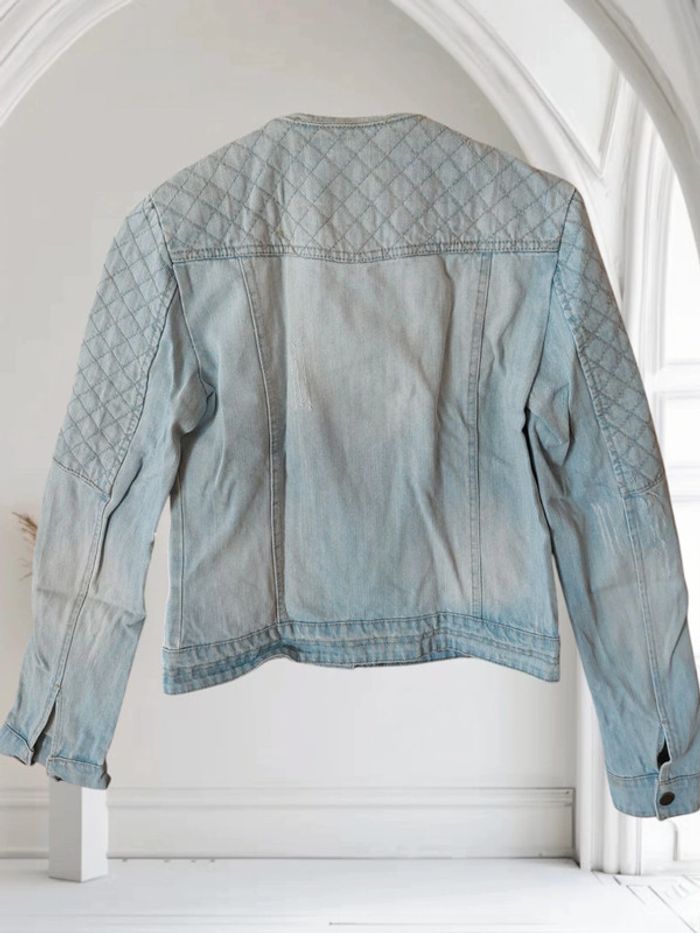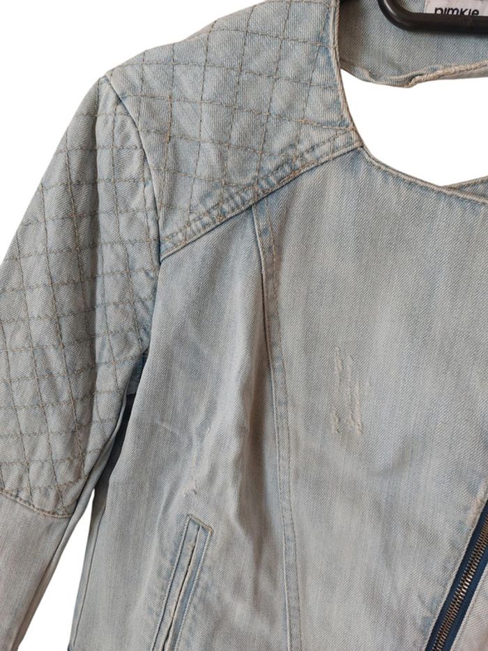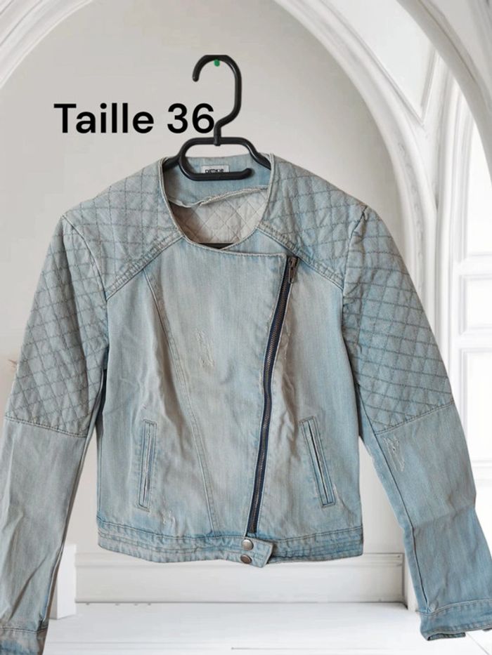 Veste courte en jean taille 36 ➡️ fausses poches devant ➡️ Effet griffure et matelassé ➡️ style biker ➡️ Porté 1 fois #vêtementfemmevalou5410