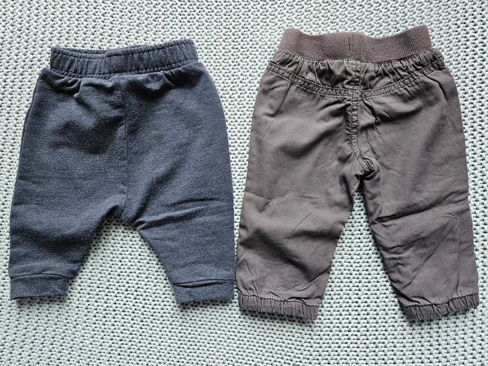 Lot de 2 pantalons à taille élastique. Marque Tex baby: sarouel bleu chiné Marque Pat et Ripaton: gris foncé, doublé à l'intérieur. Taille 3 mois. #mimidacenfant #mimidacgarçon3mois