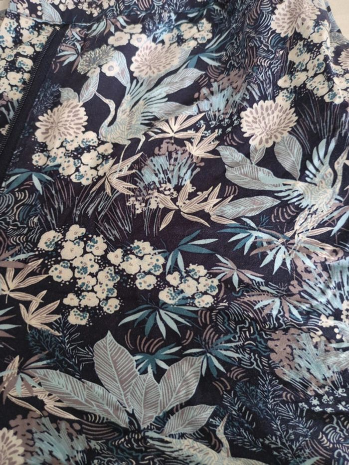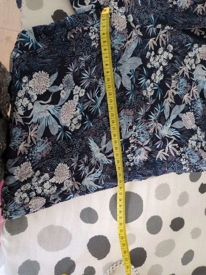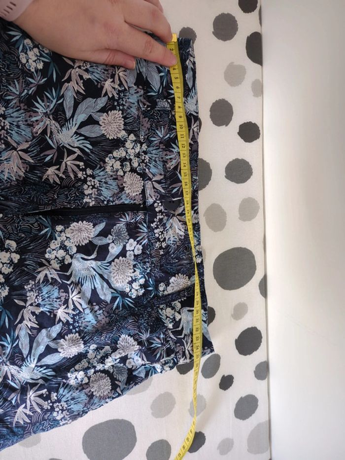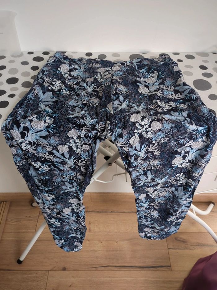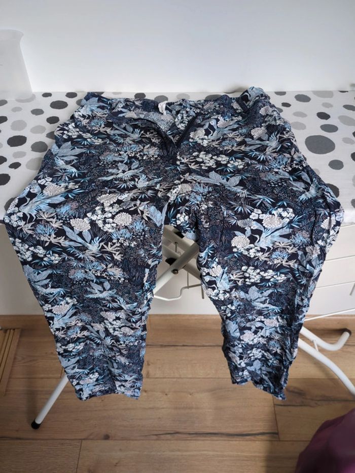 Pantalon fluide de chez cache cache mais ⚠️ sans taille et je ne m'en rappelle pas, d'où les prises de mesures, de couleur bleu à motifs