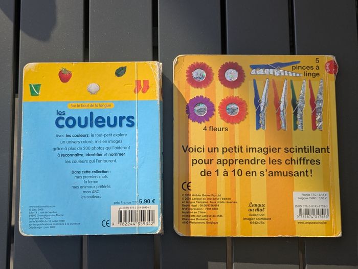 Bonjour, Je vends ce lot de 2 livres pour apprendre les chiffres et les couleurs. Couverture abîmée mais pages en bon état.