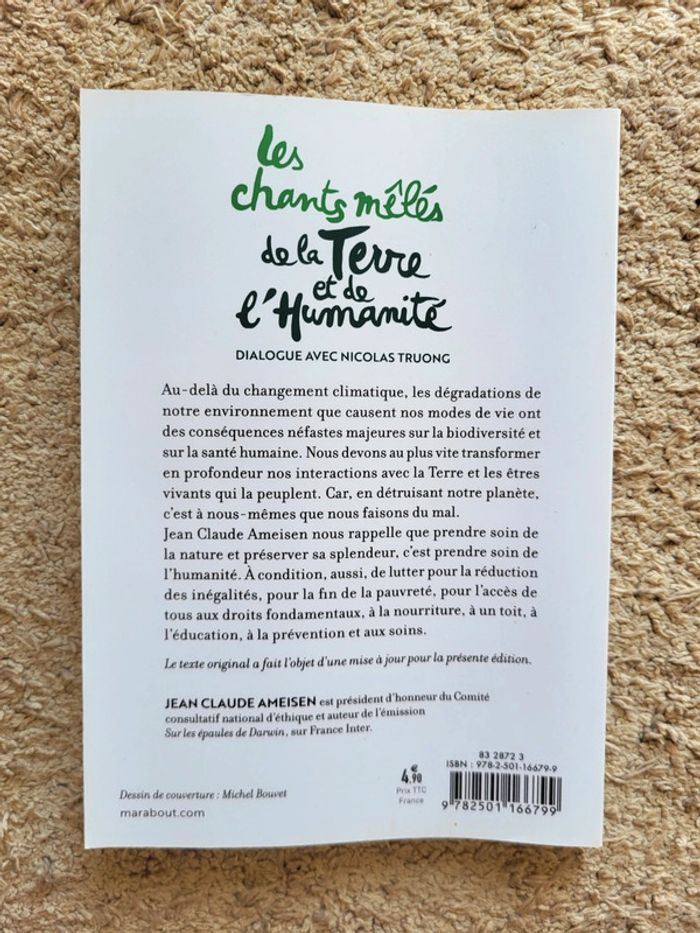 ⭐️ Nombreux livres dans mon dressing réductions sur les lots activées ✨️ 📚 Livre "Les chants mêlés de la Terre et de l’humanité" de Jean-Claude Ameisen, médecin, chercheur et conteur humaniste, connu pour son émission "Sur les épaules de Darwin" (France Inter) 📖 Très bon état 📕 Dans cet ouvrage tiré de ses chroniques radiophoniques, Jean-Claude Ameisen explore les origines de la vie, l’évolution des espèces, la conscience humaine, la solidarité, et la place de l’homme dans le vivant. À travers une narration riche en références scientifiques, littéraires et philosophiques, il tisse des liens entre nature, humanité, art et science, pour mieux comprendre ce que signifie "être vivant" ensemble sur la Terre.