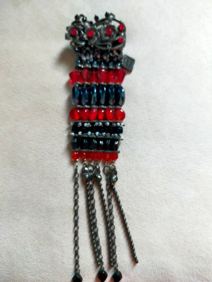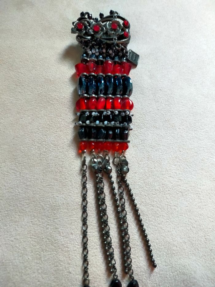Broche signée Marc LABAT – Style baroque bohème noir et rouge avec pampilles